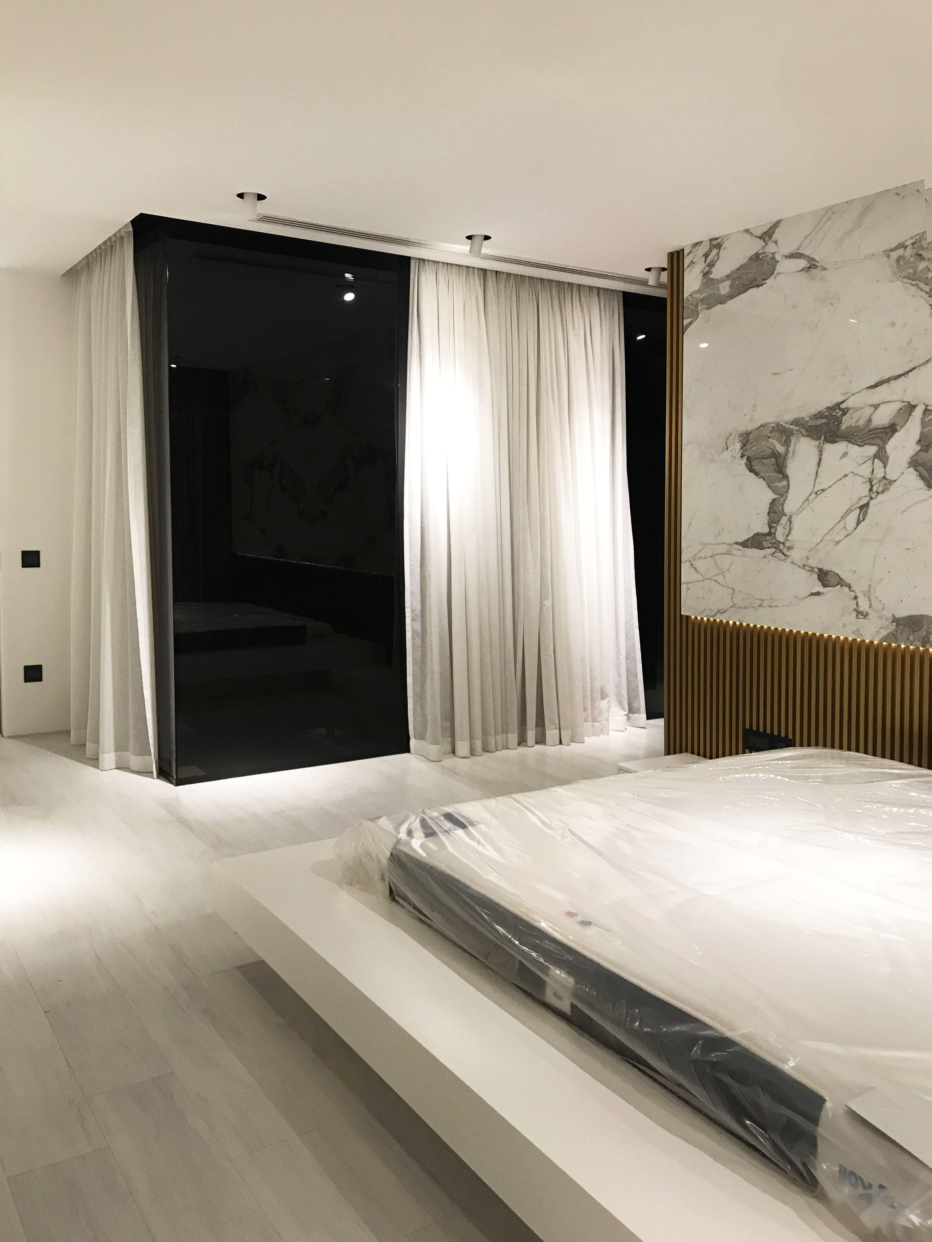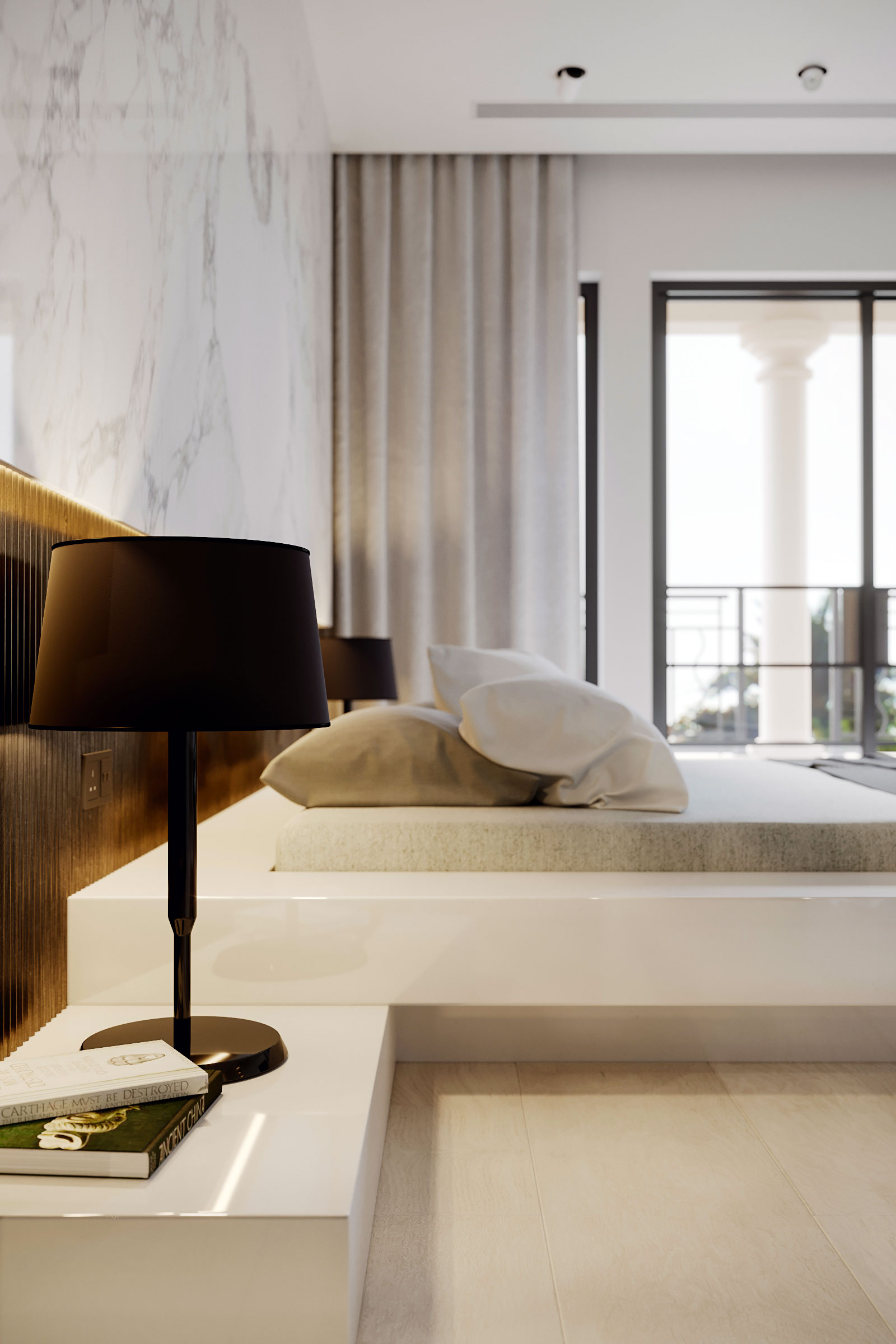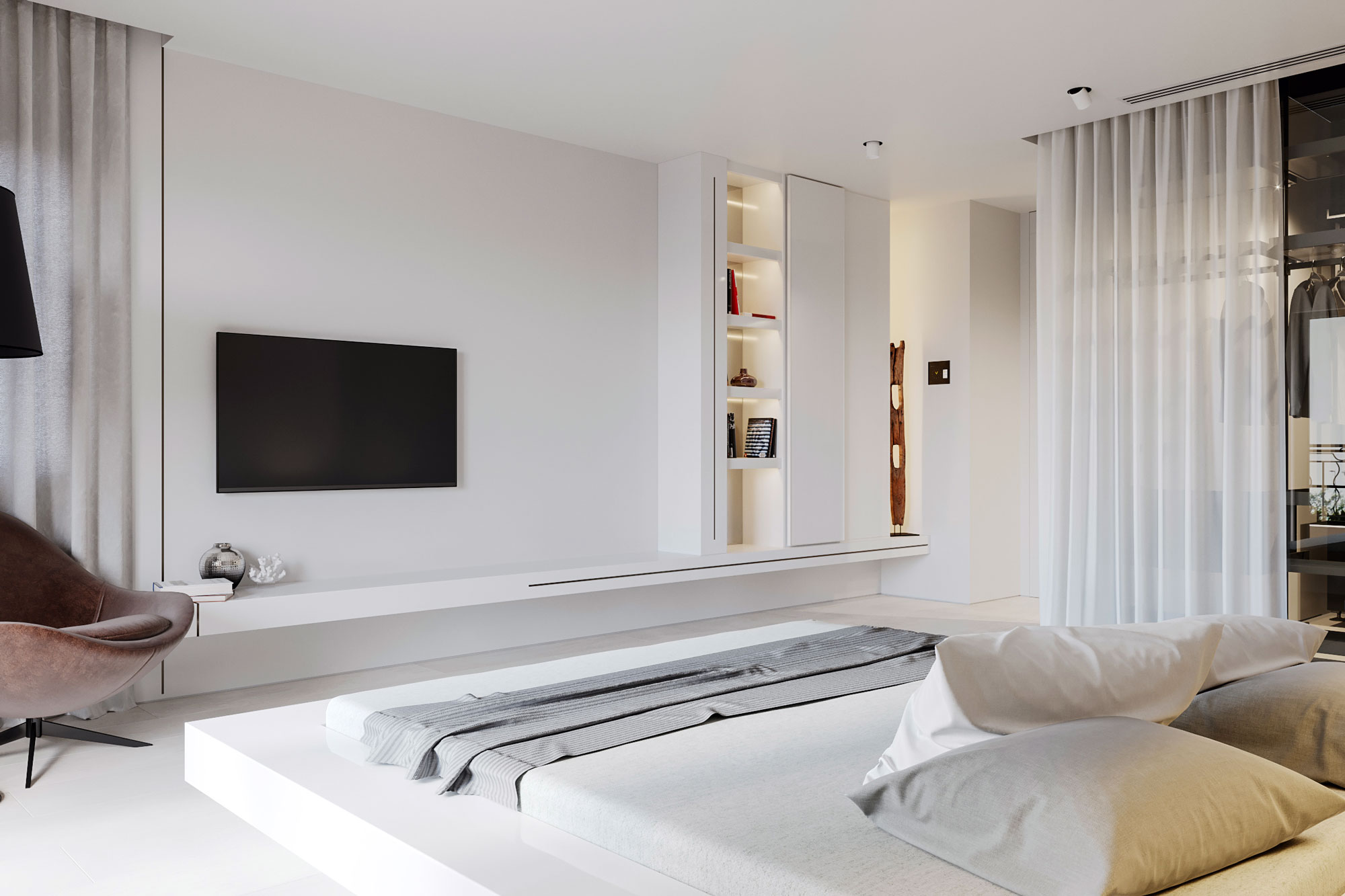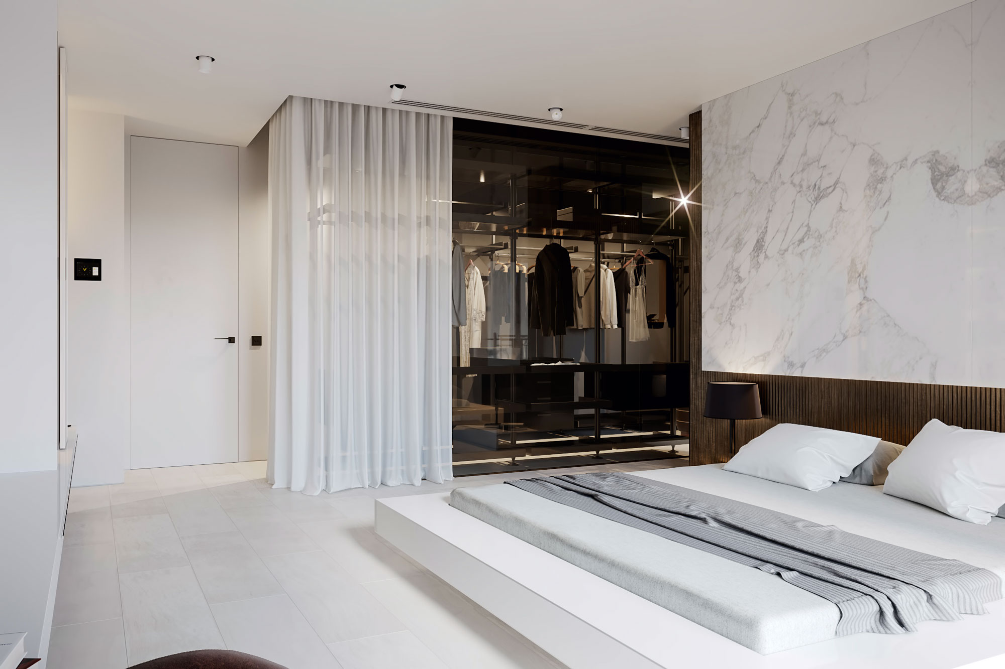 Master bedroom is a part of Dubai Villa project. Bedroom divided into few areas: walk-through wardrobe, corner for laptop, bed area and bathroom with the open entrance.