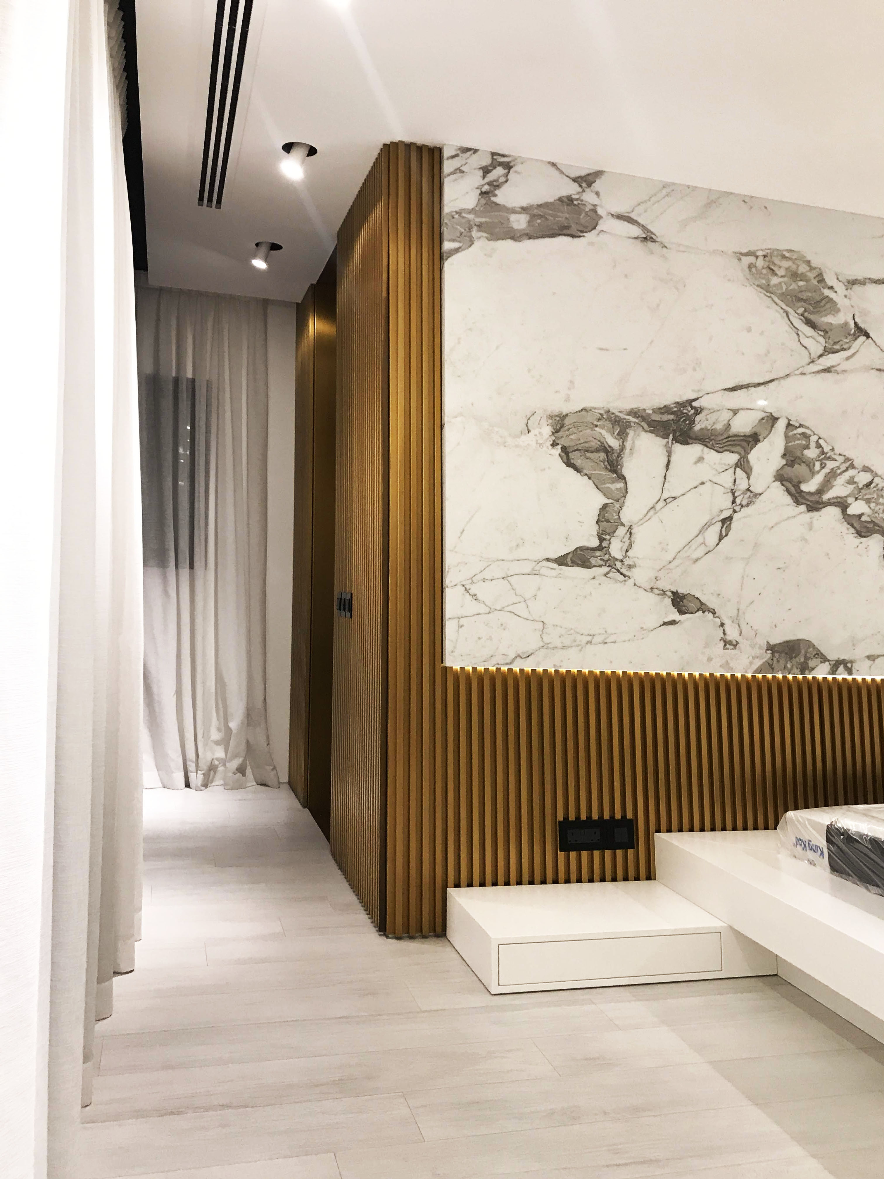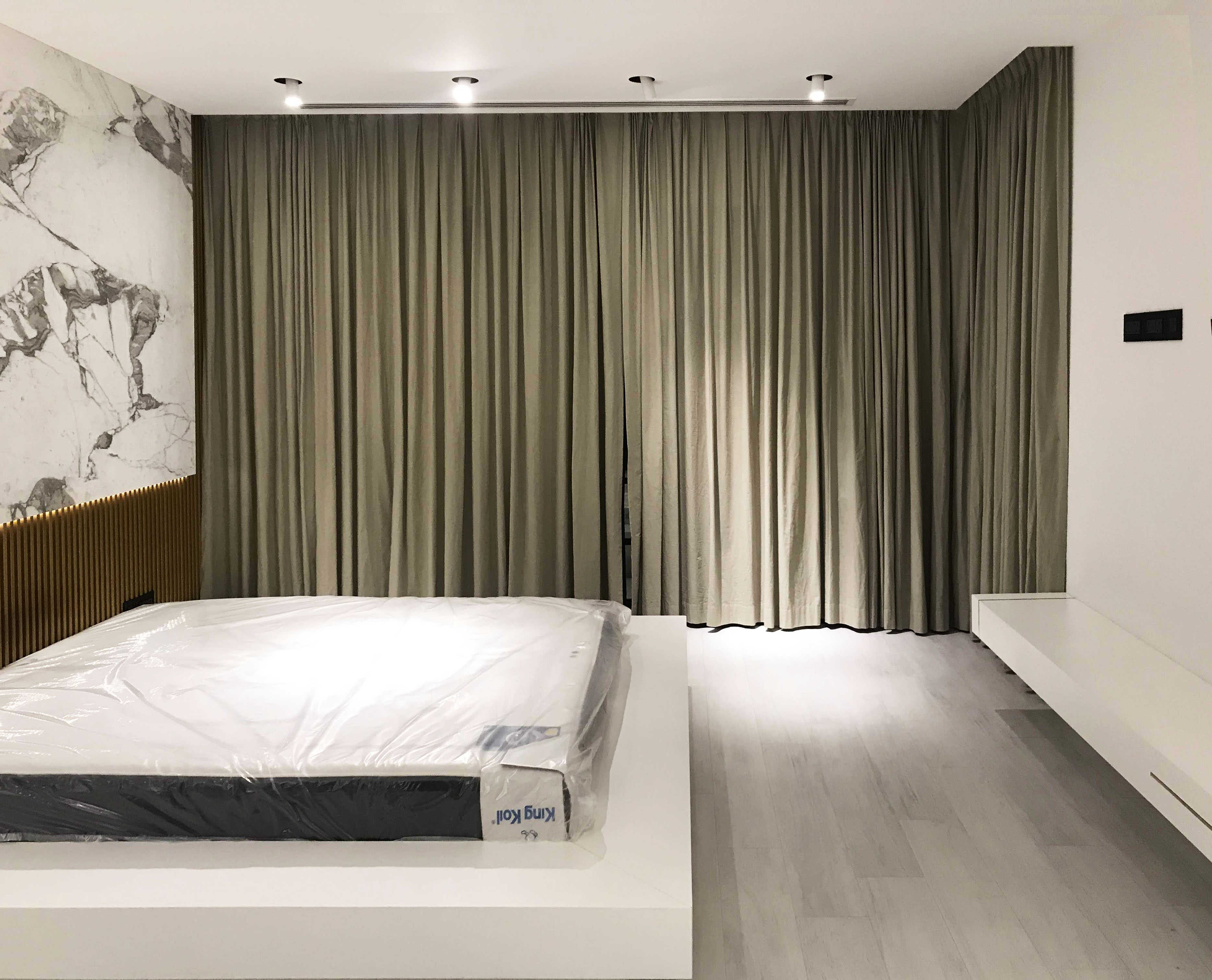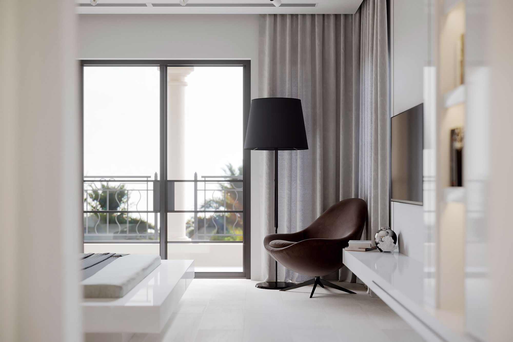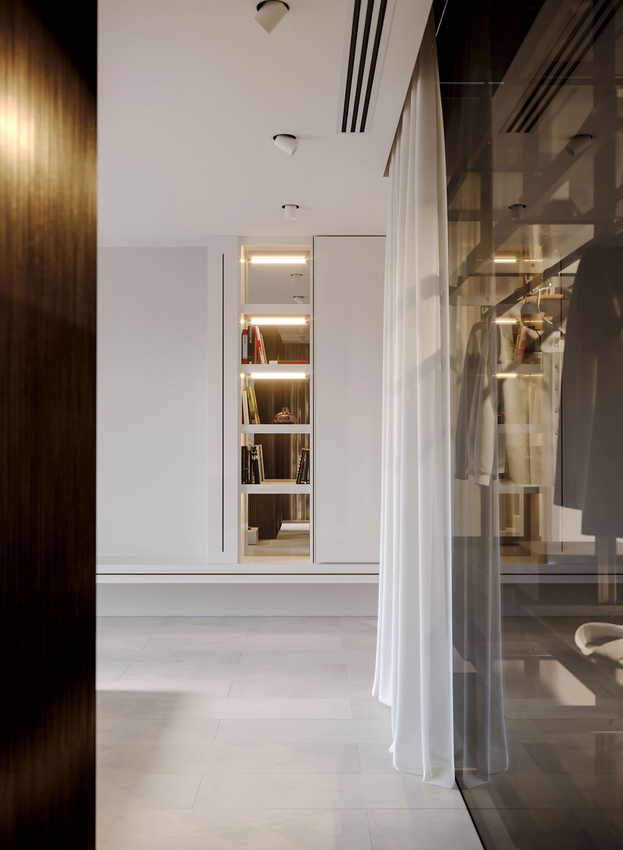 Master bedroom is a part of Dubai Villa project. Bedroom divided into few areas: walk-through wardrobe, corner for laptop, bed area and bathroom with the open entrance.