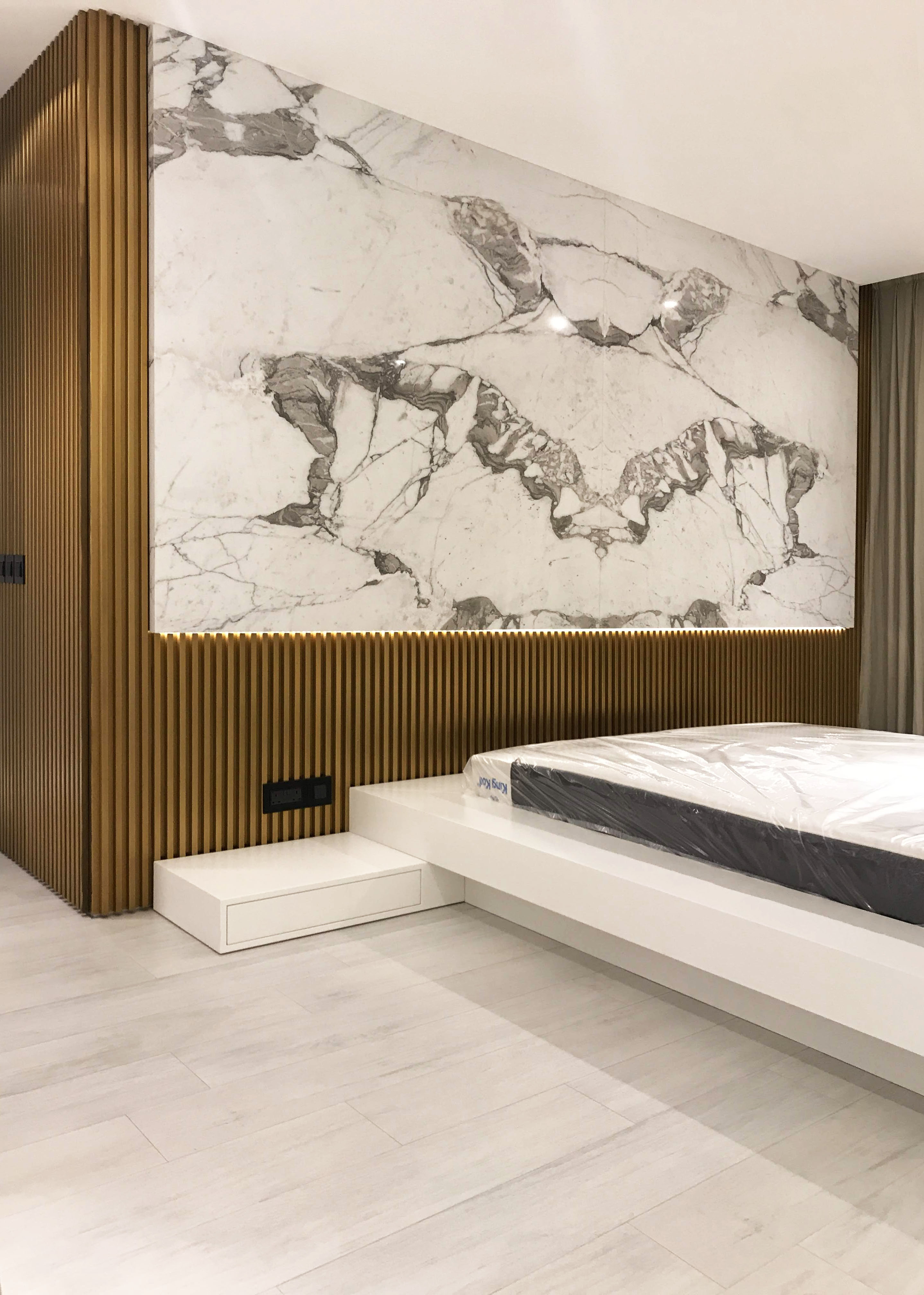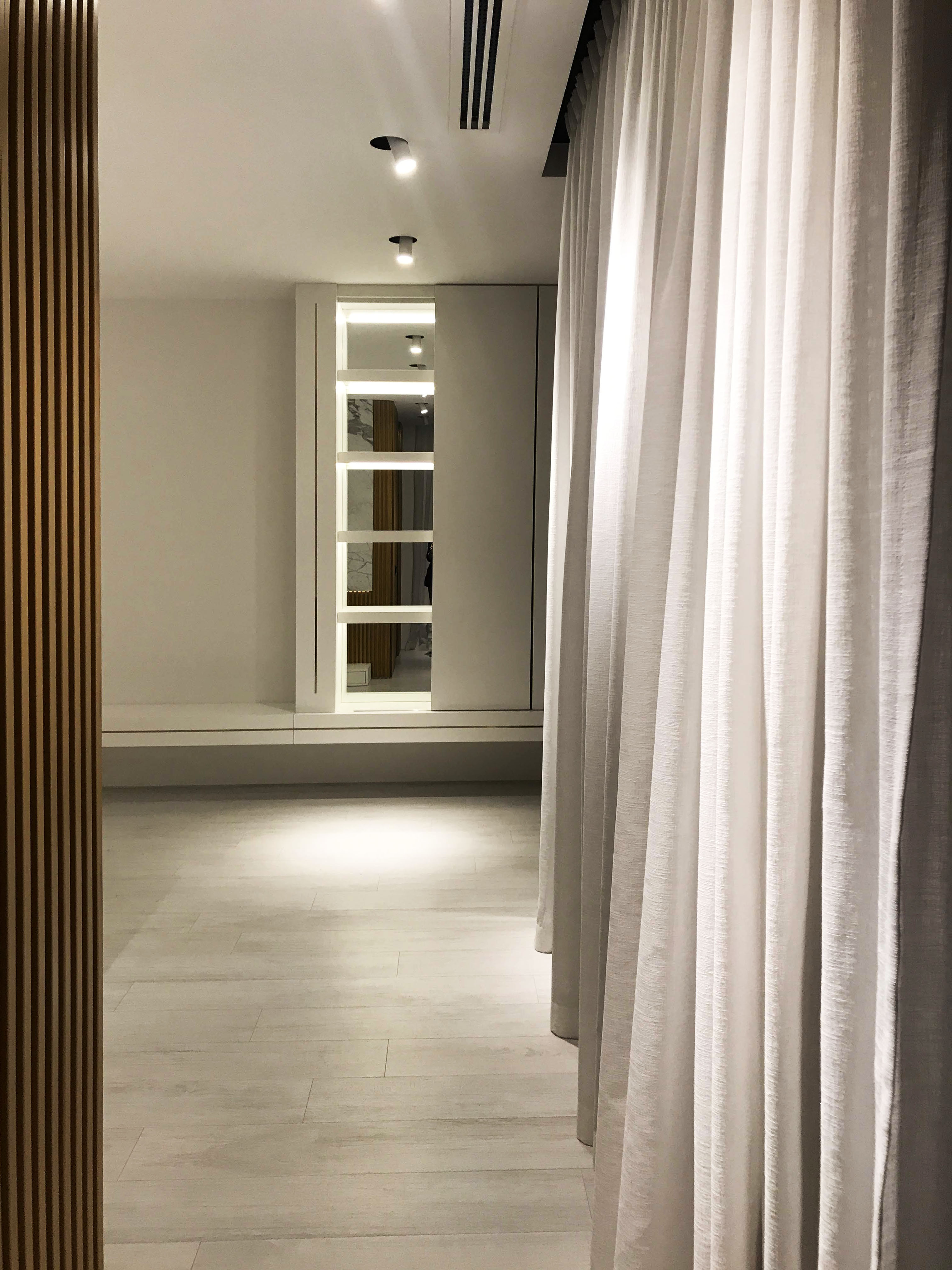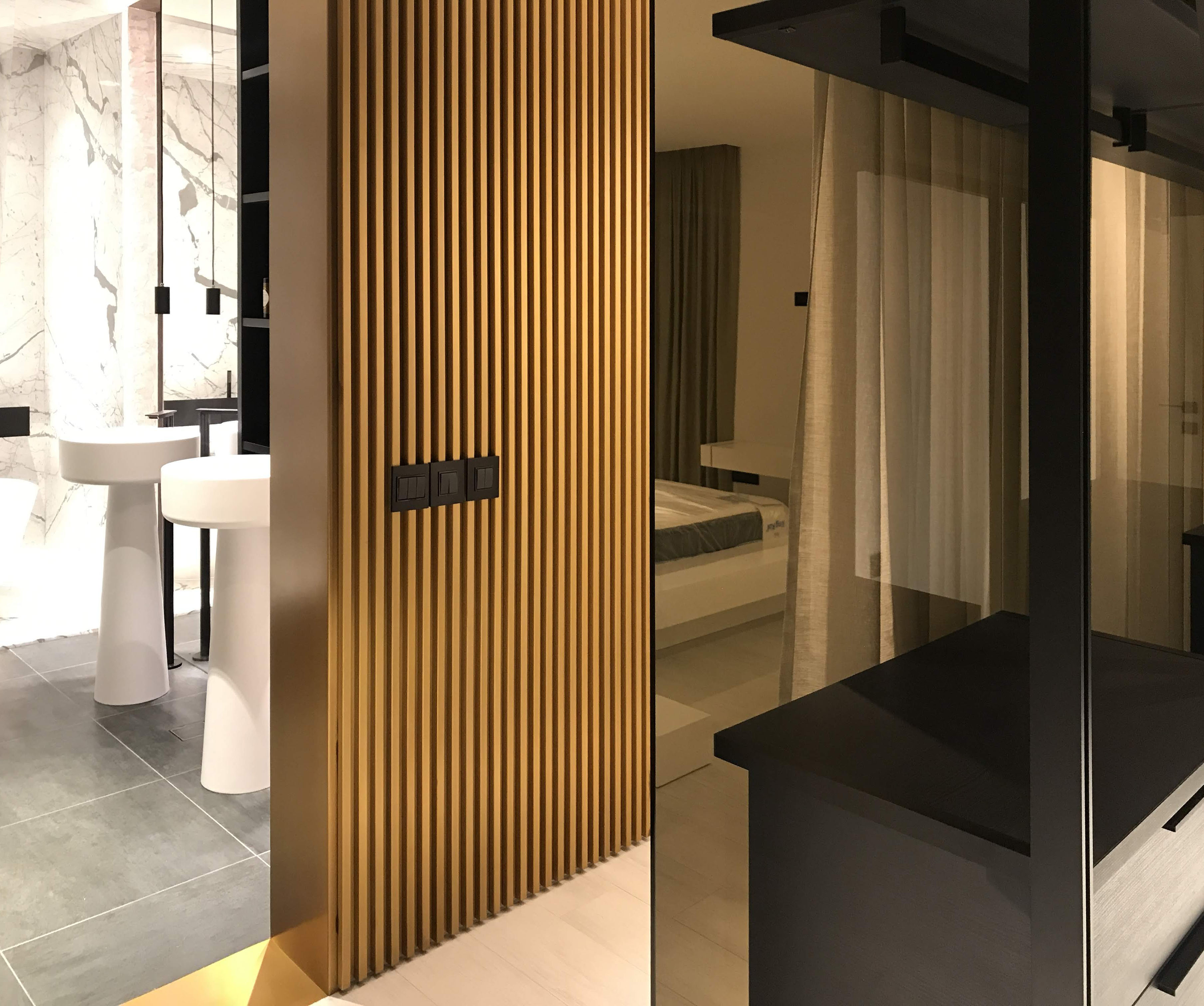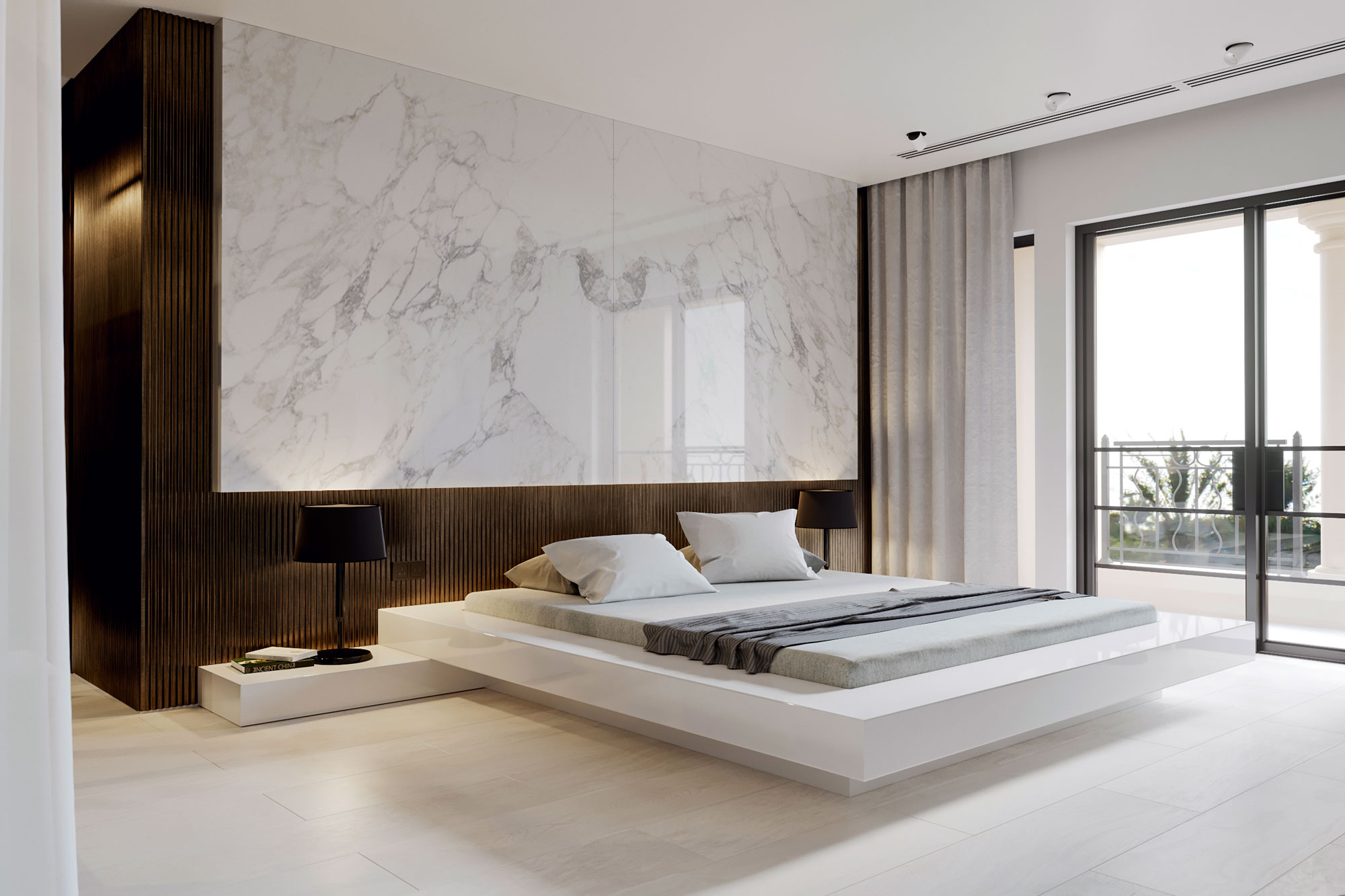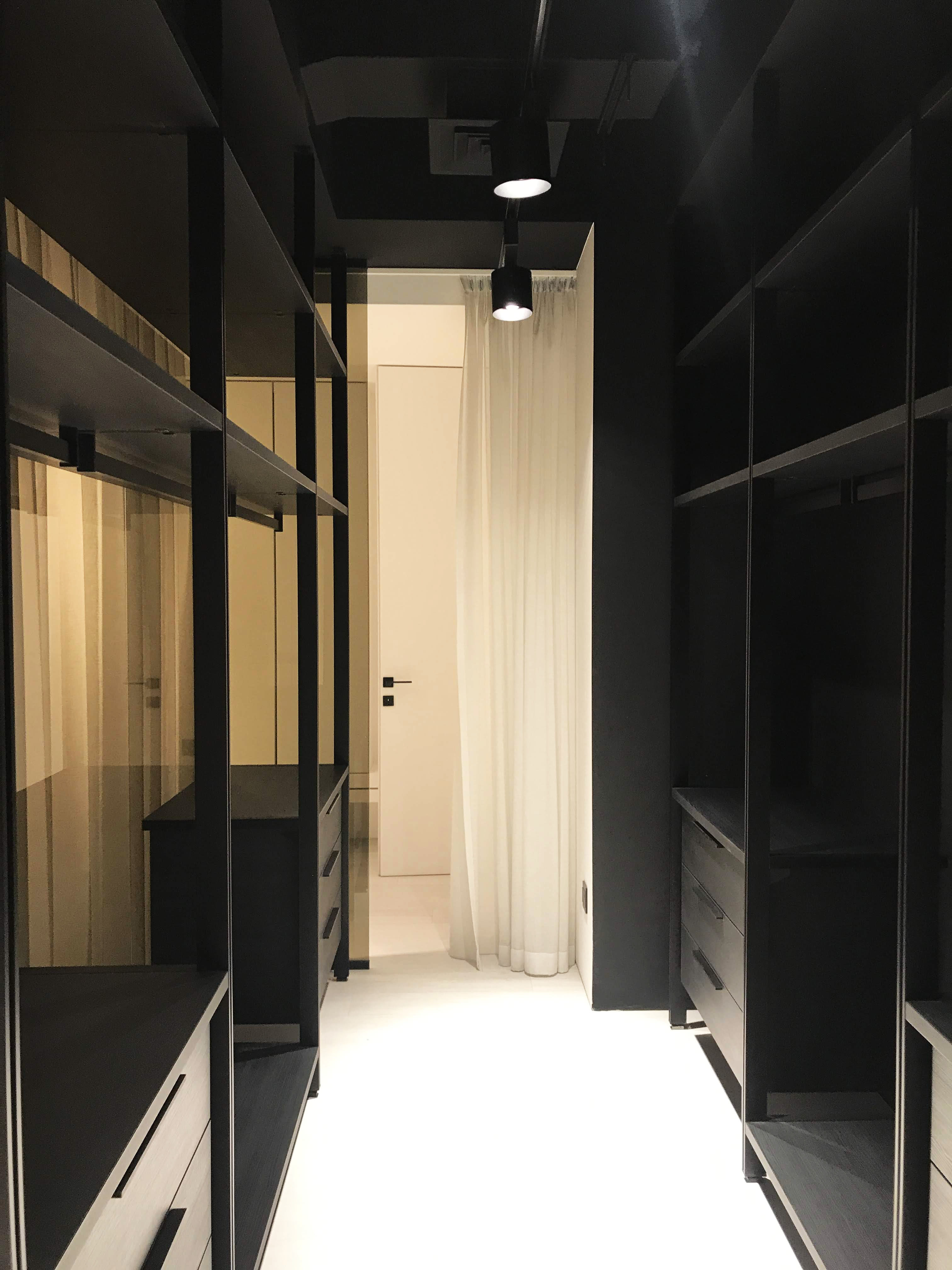 Master bedroom is a part of Dubai Villa project. Bedroom divided into few areas: walk-through wardrobe, corner for laptop, bed area and bathroom with the open entrance.