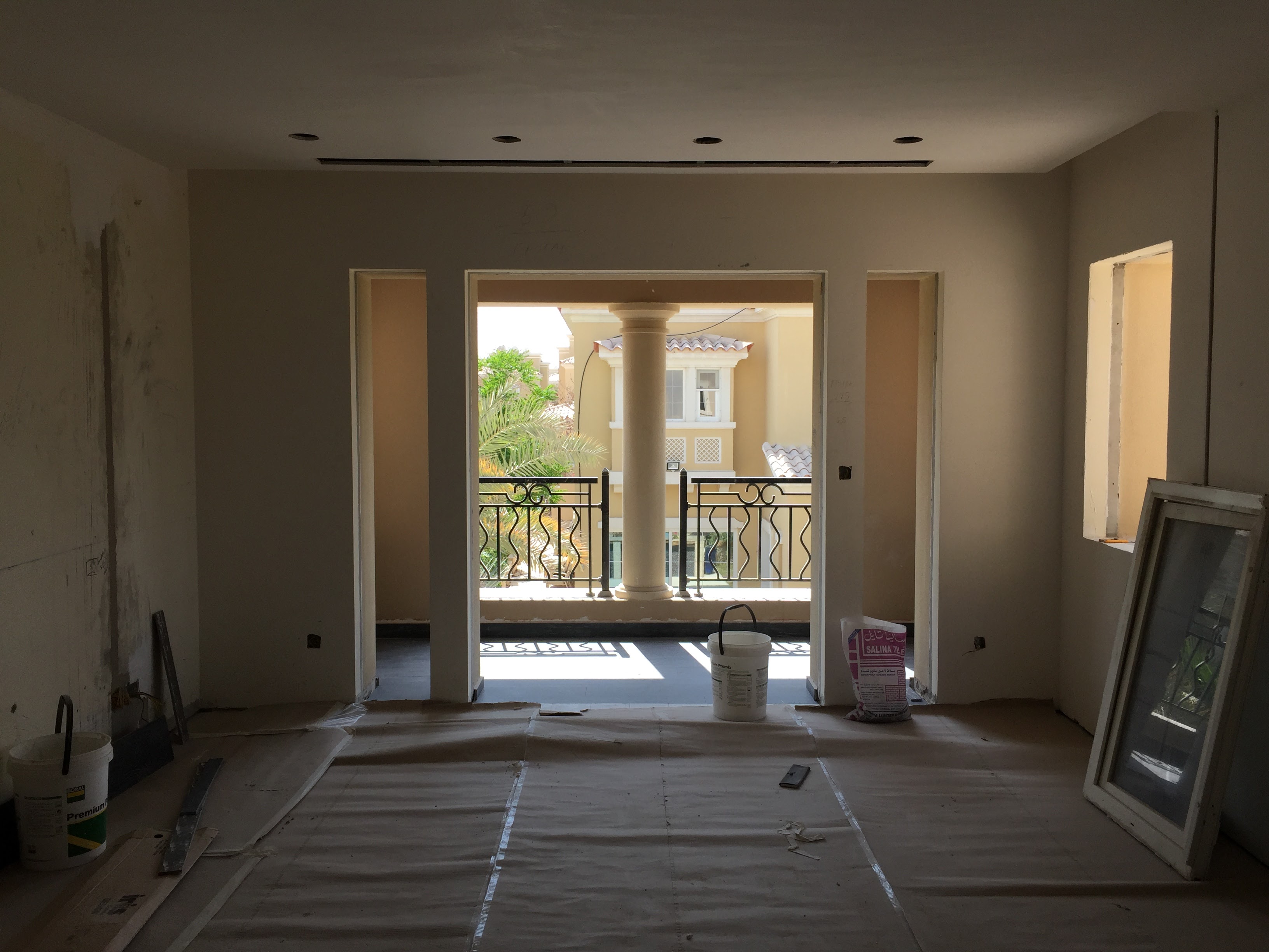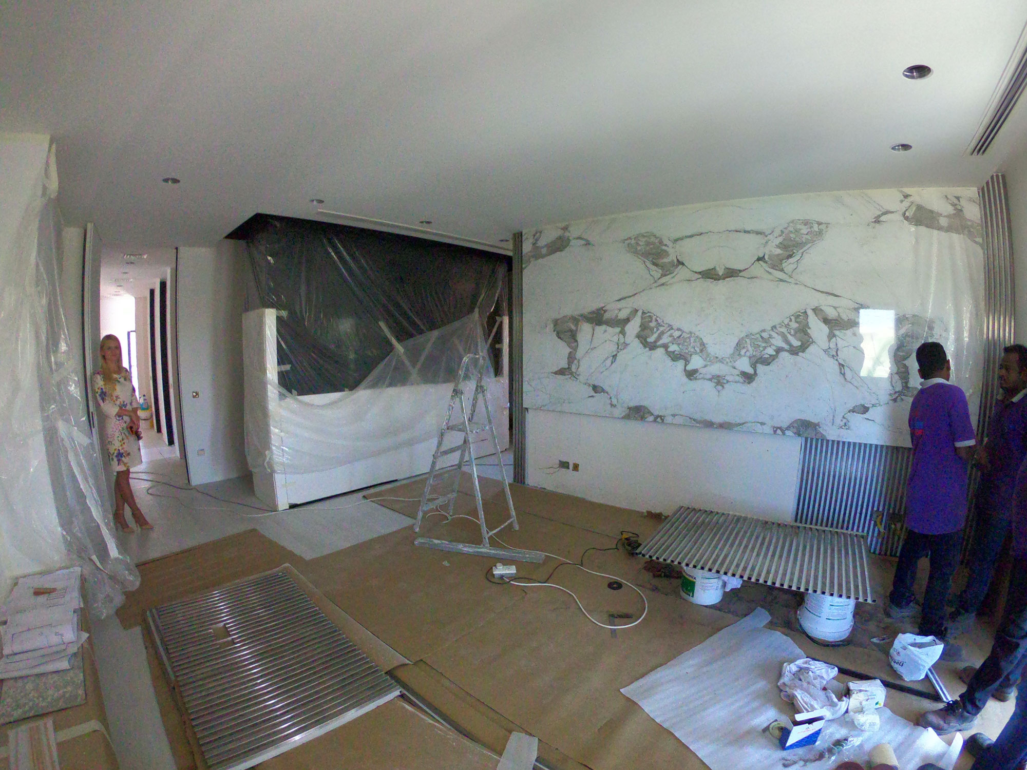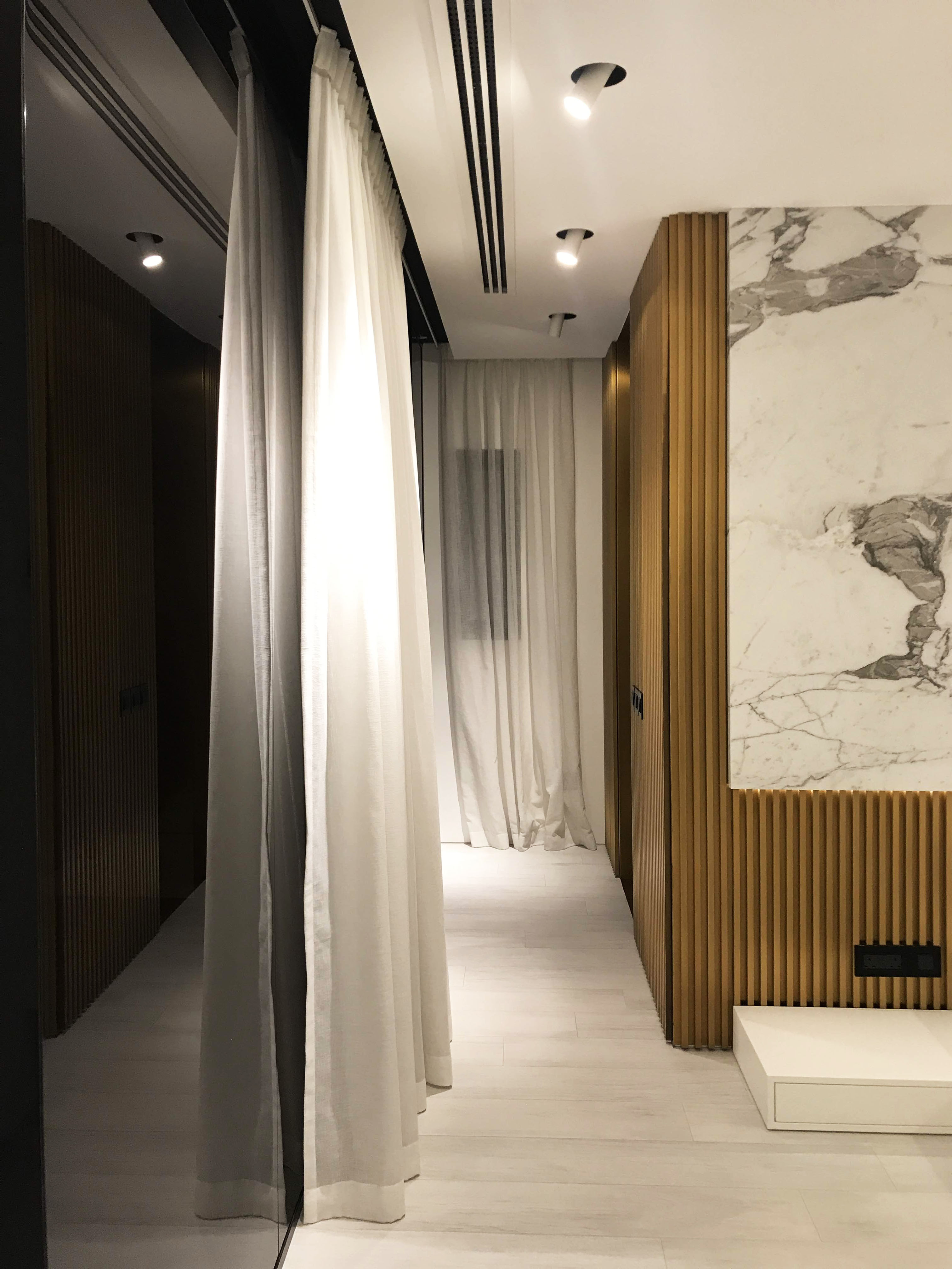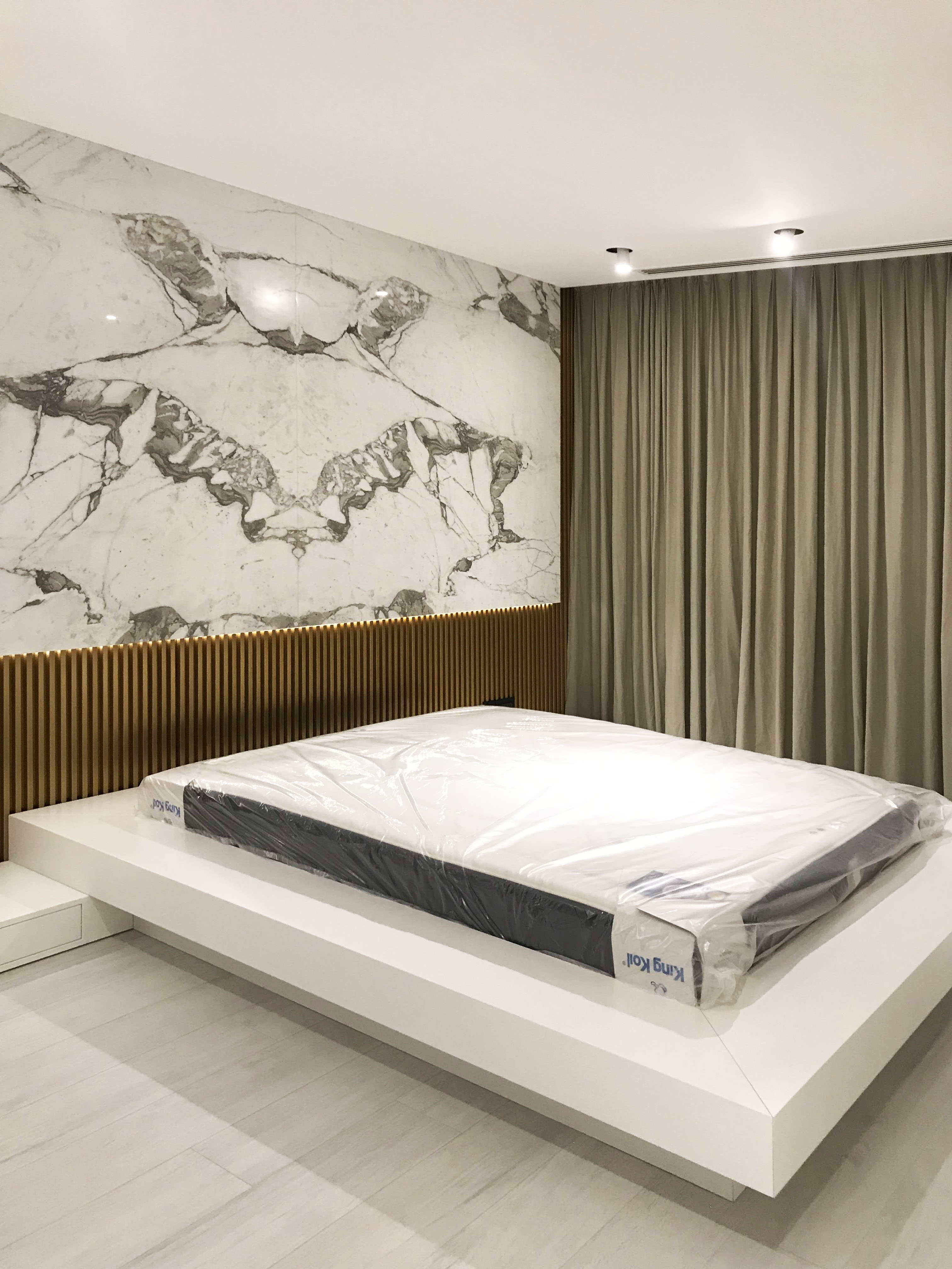 Master bedroom is a part of Dubai Villa project. Bedroom divided into few areas: walk-through wardrobe, corner for laptop, bed area and bathroom with the open entrance.