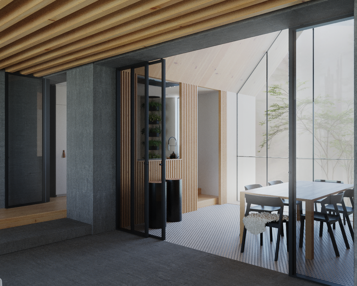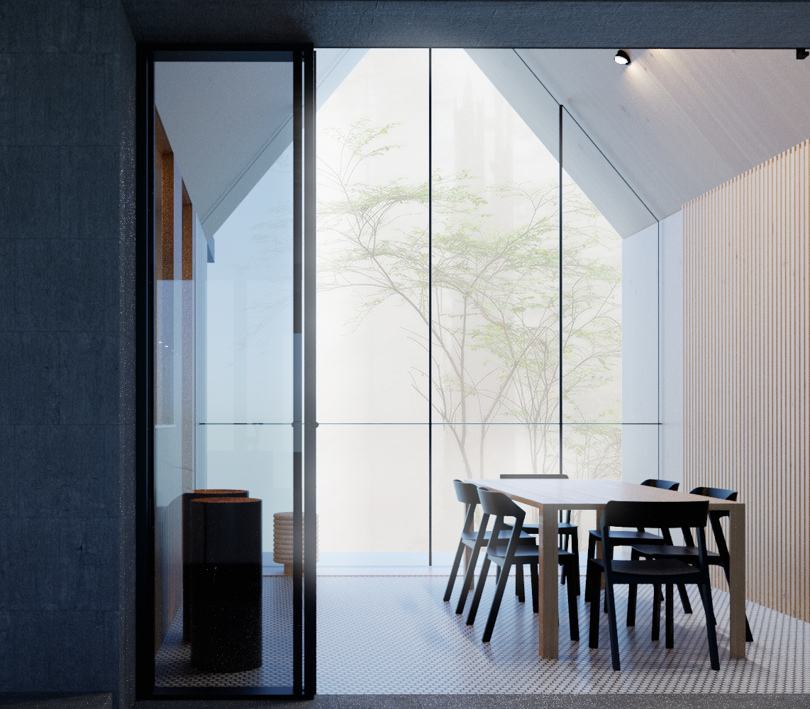 The transparent sliding doors divide dining and living areas, creating two separate spaces, or one extensive living area when they are open.