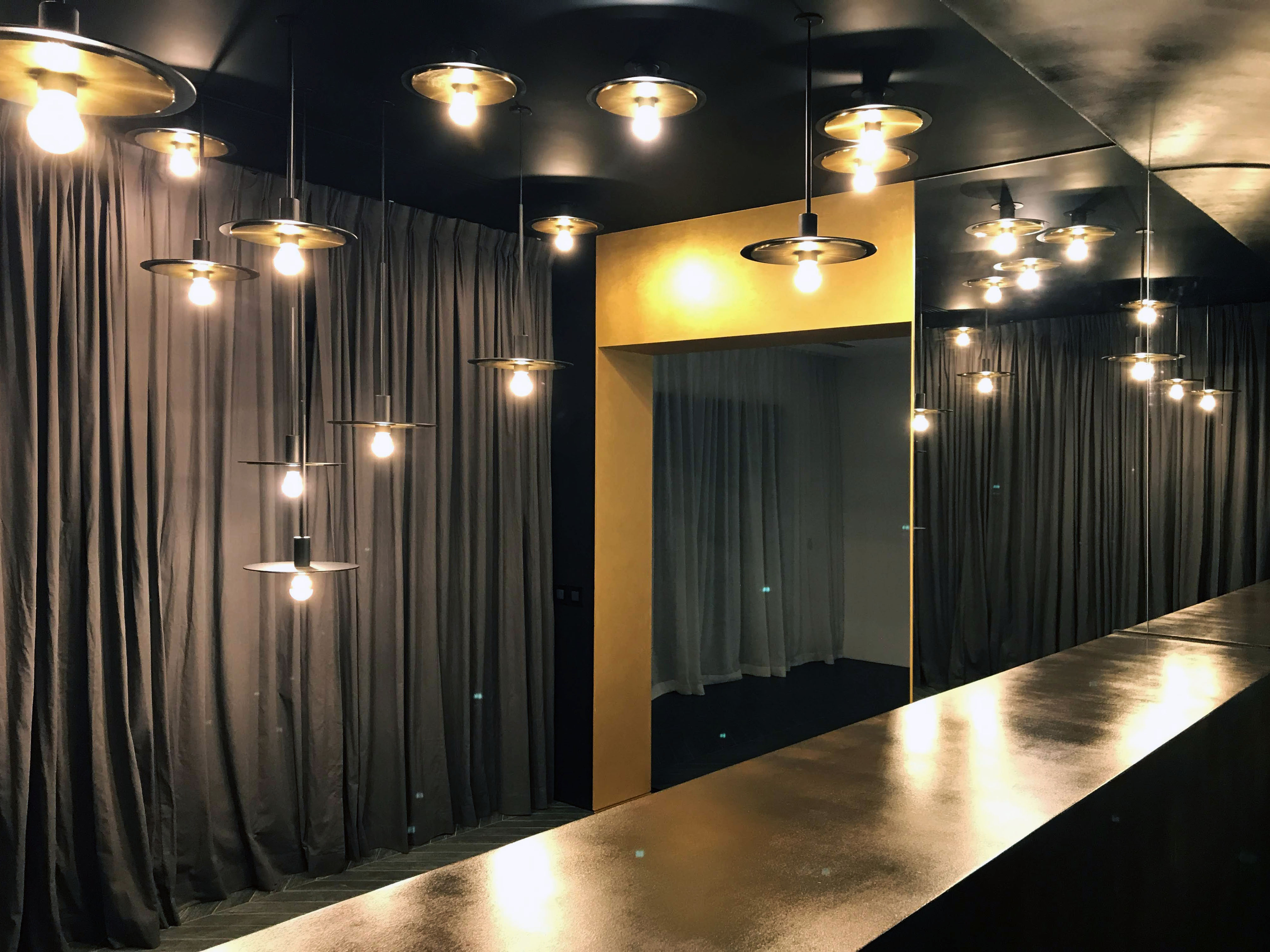 Personal Bar. Behind the sliding door, entrance to the home bar decorated with bronze. Concrete bar corner connected with a mirror wall, which visually doubled its size. Ceiling and wall covered in dark plaster. In the center is furniture combination with leather armchairs and marble table.