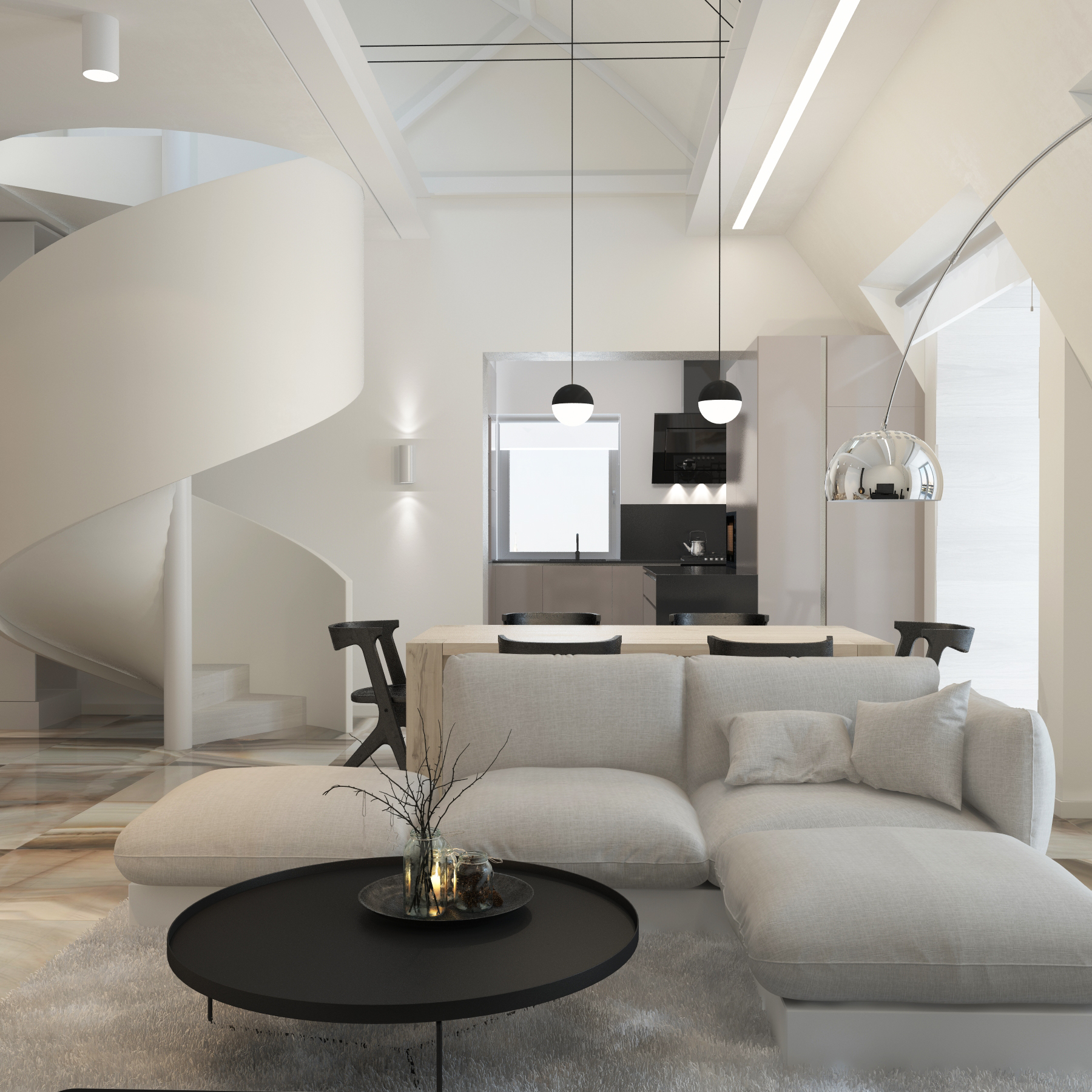 Living room for a young family, part of the penthouse design project. Living and dining room is a one open space connected with a small kitchen.