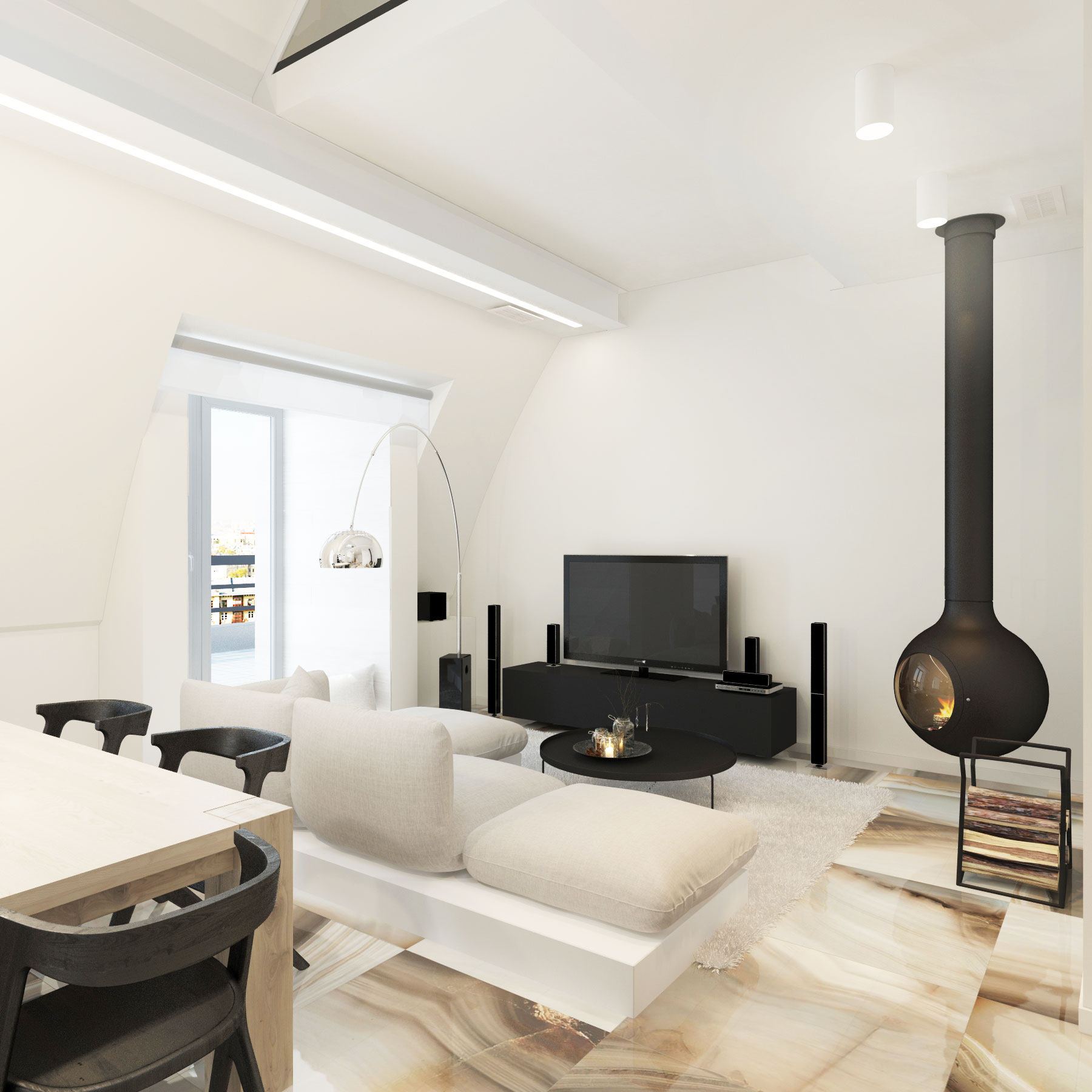 First option of the penthouse design project. Living room with full concrete stairs, fireplace and copper wall.