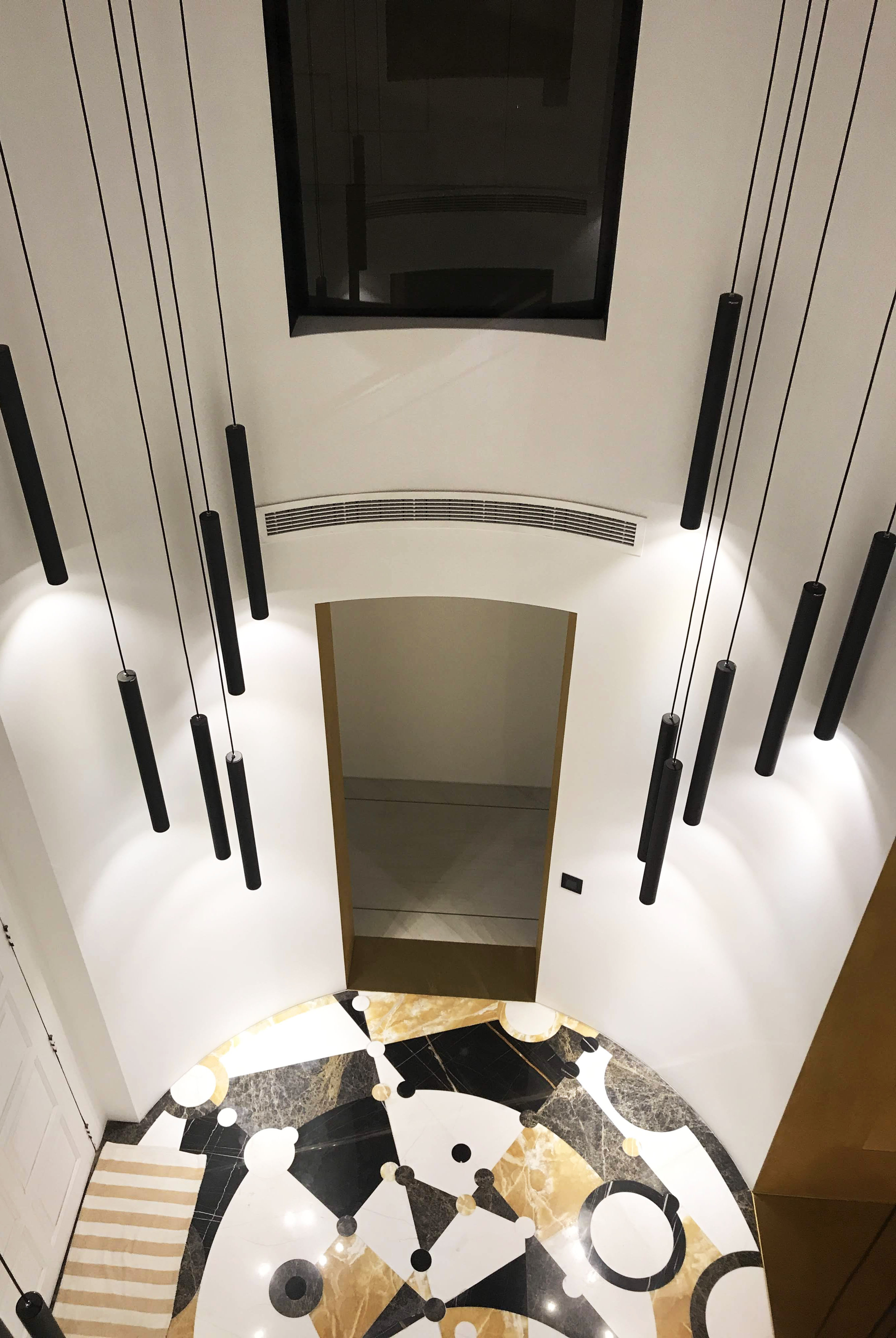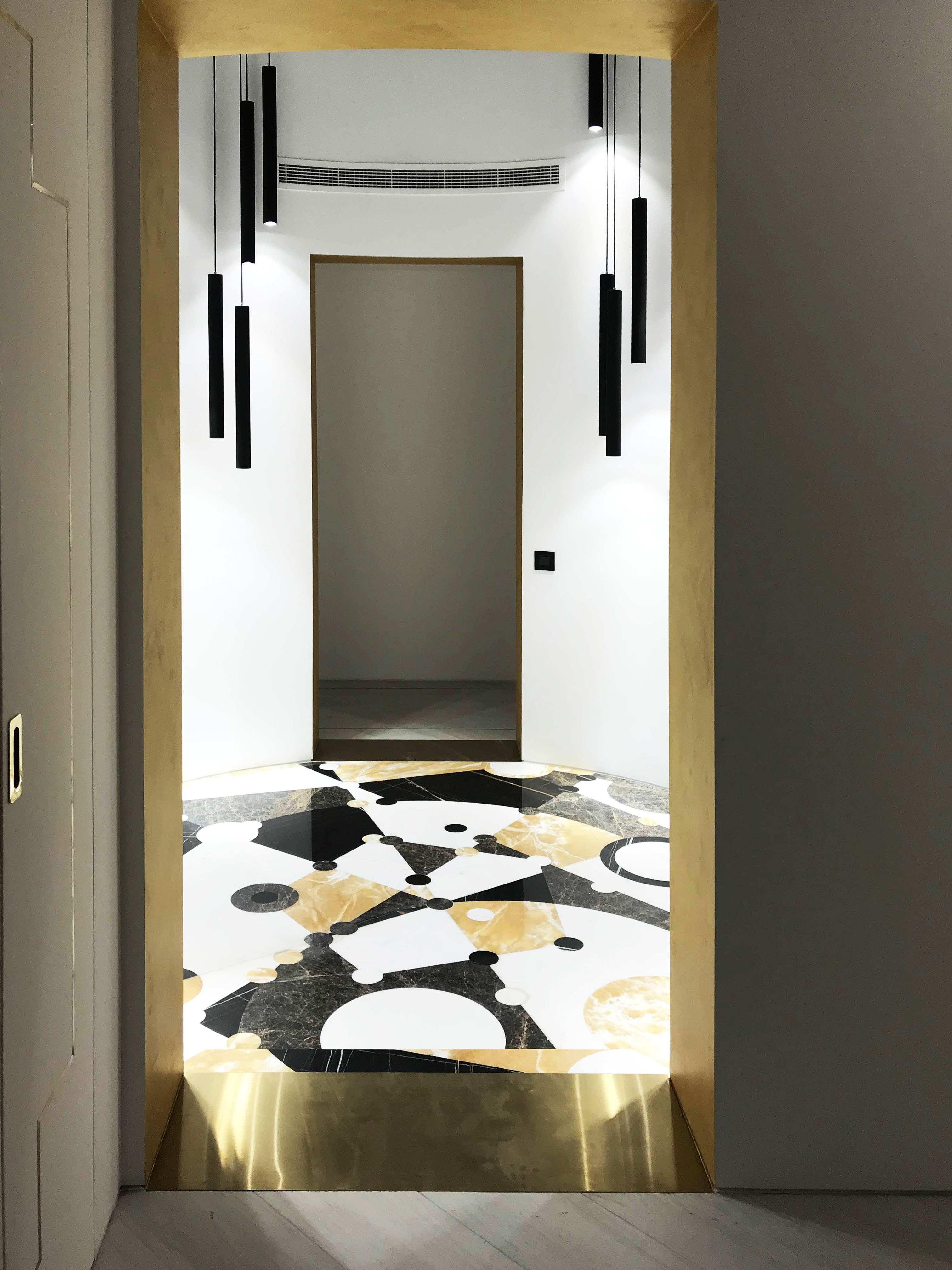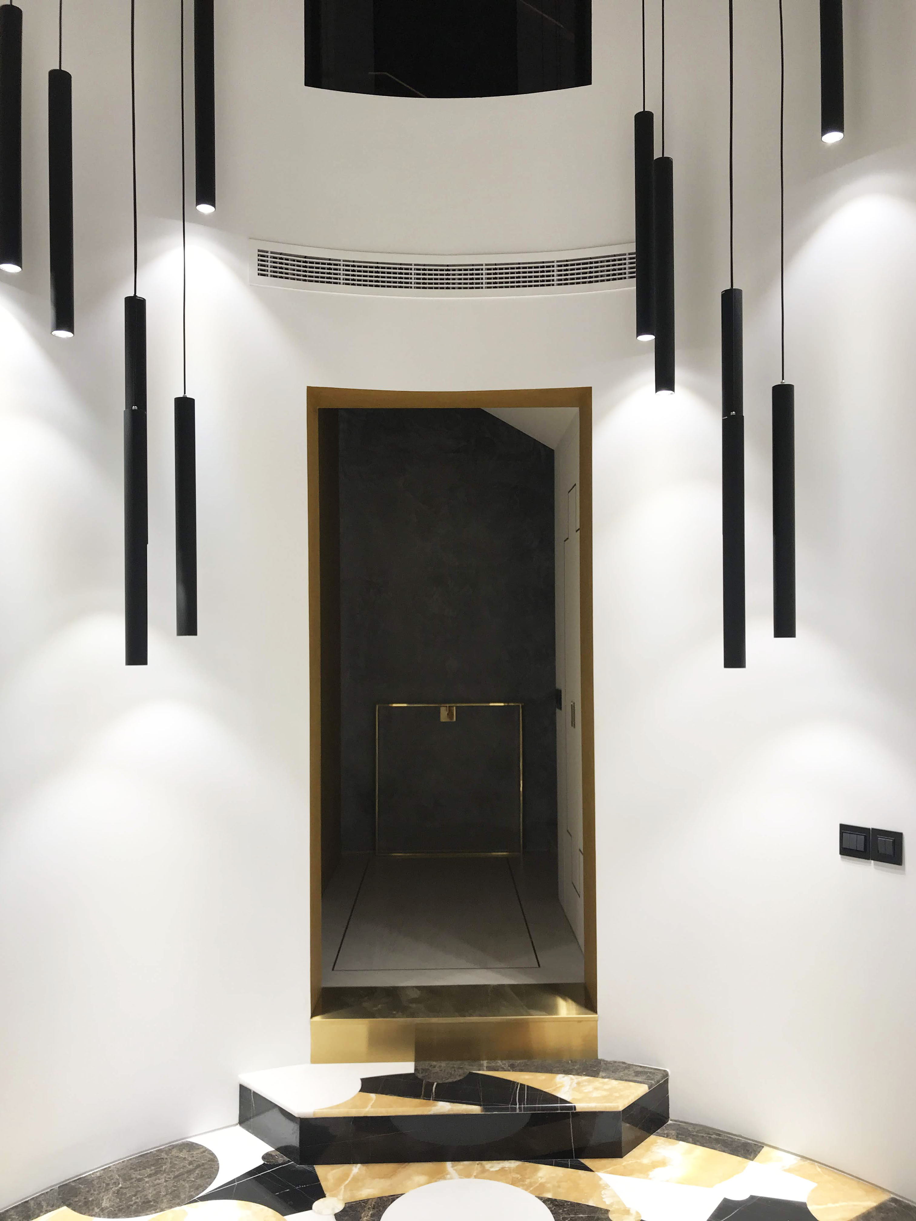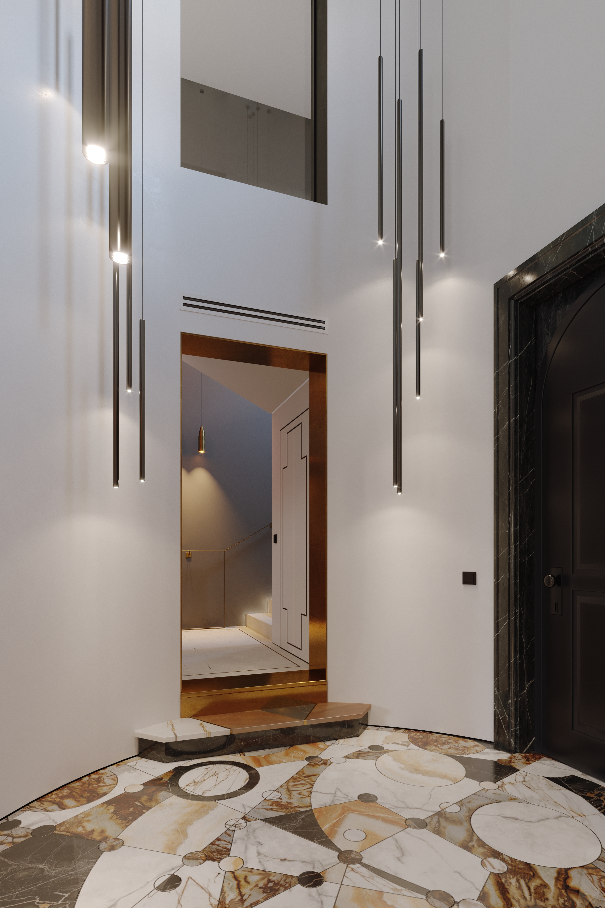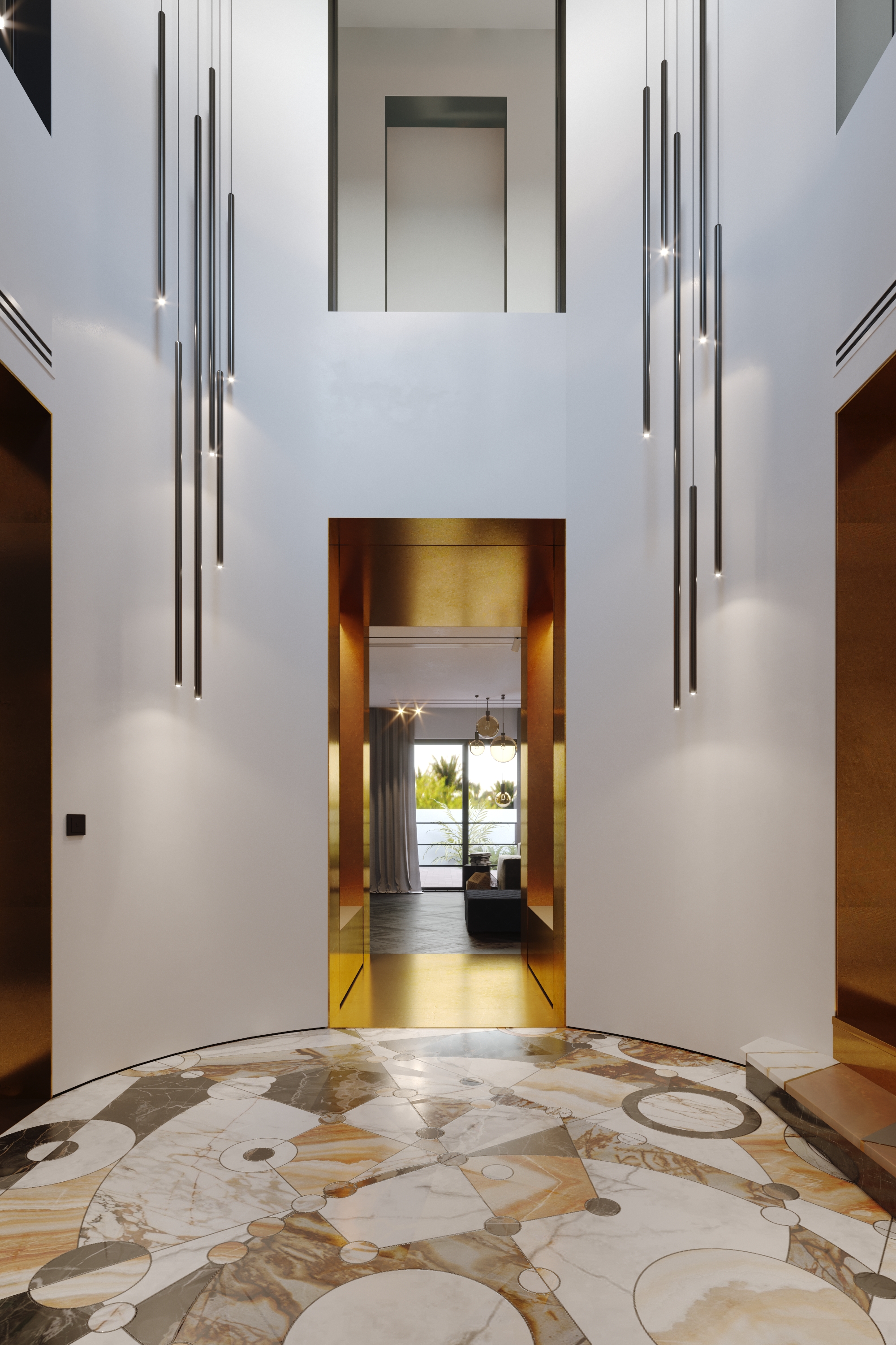 The main entrance to the Villa is round shape, two floors high. On a floor is a panno of marble and onyx combinations. The picture reflects alchemy formula of creation gold. Three doorways covered in yellow metal. The main door decorated with a black marble frame.
