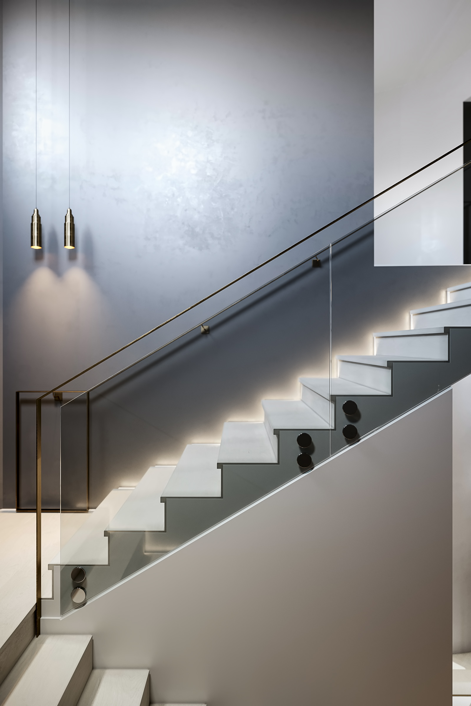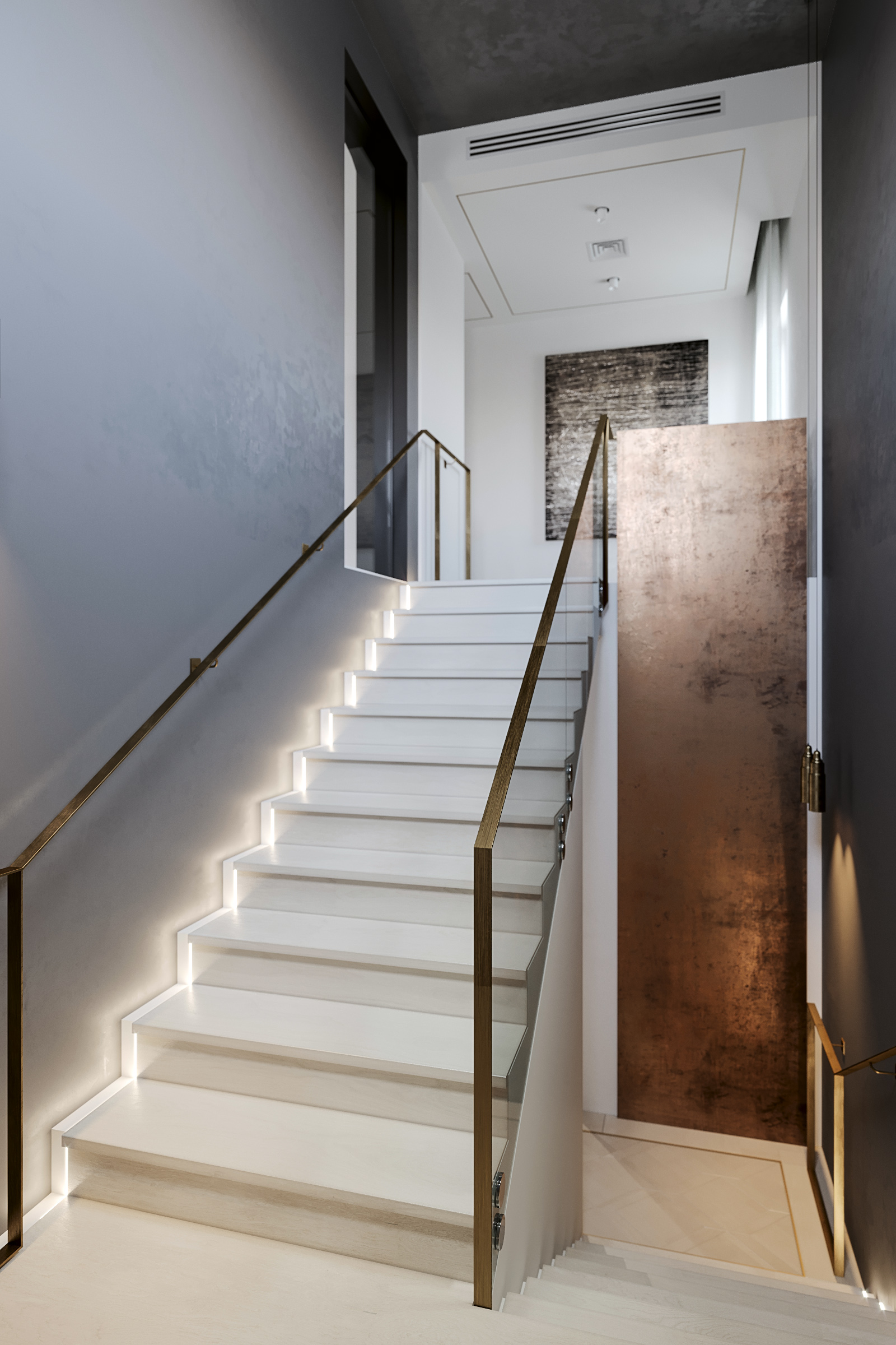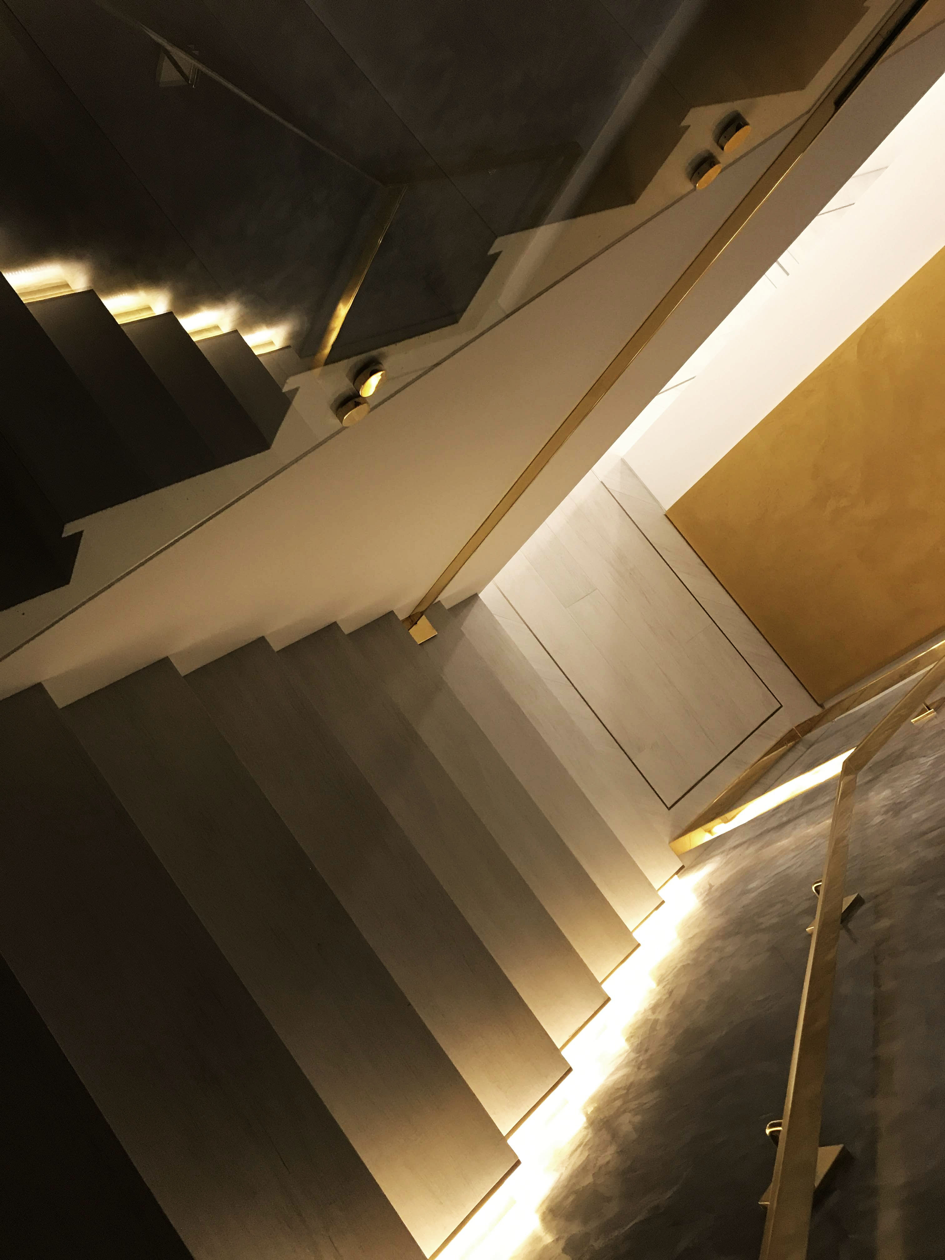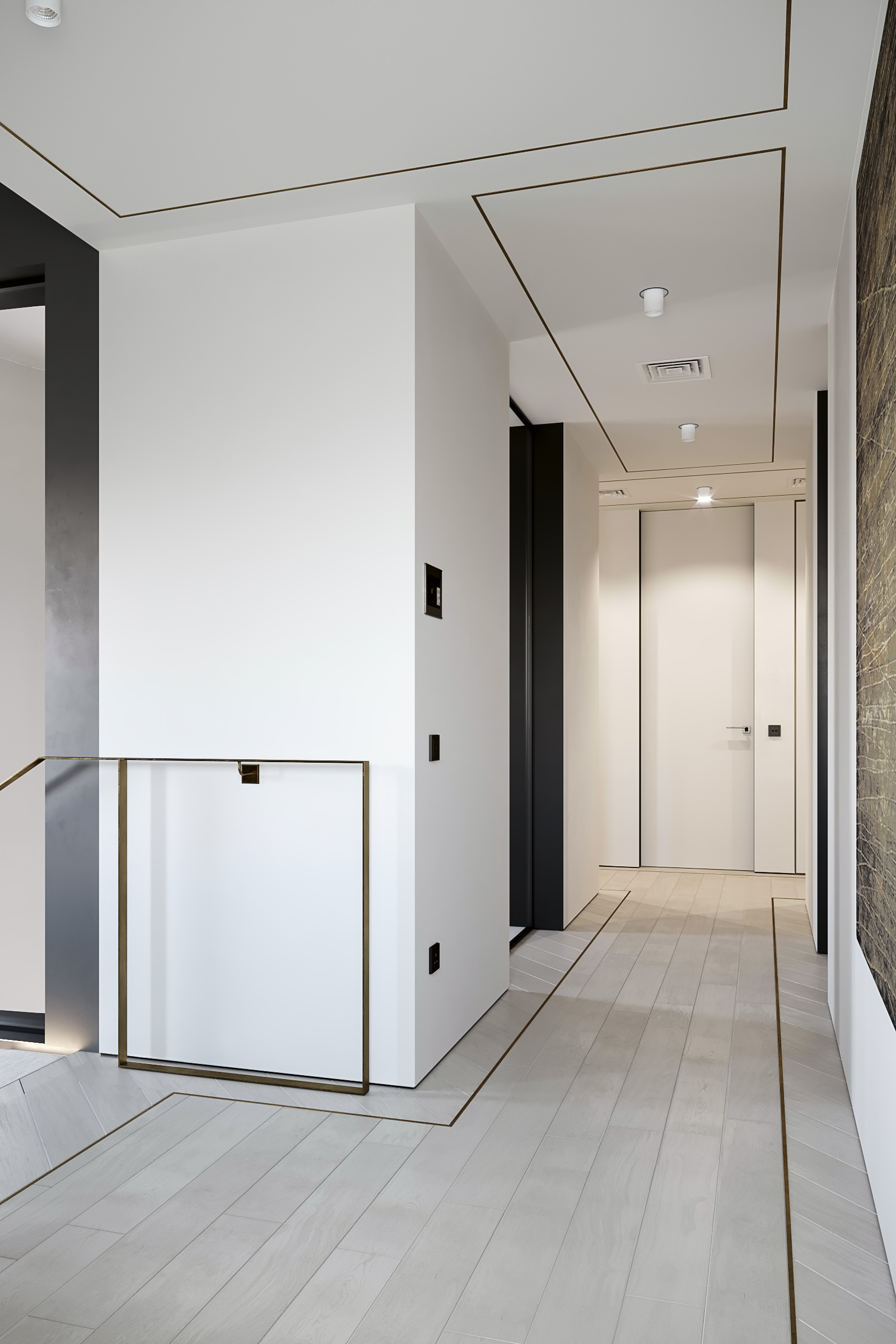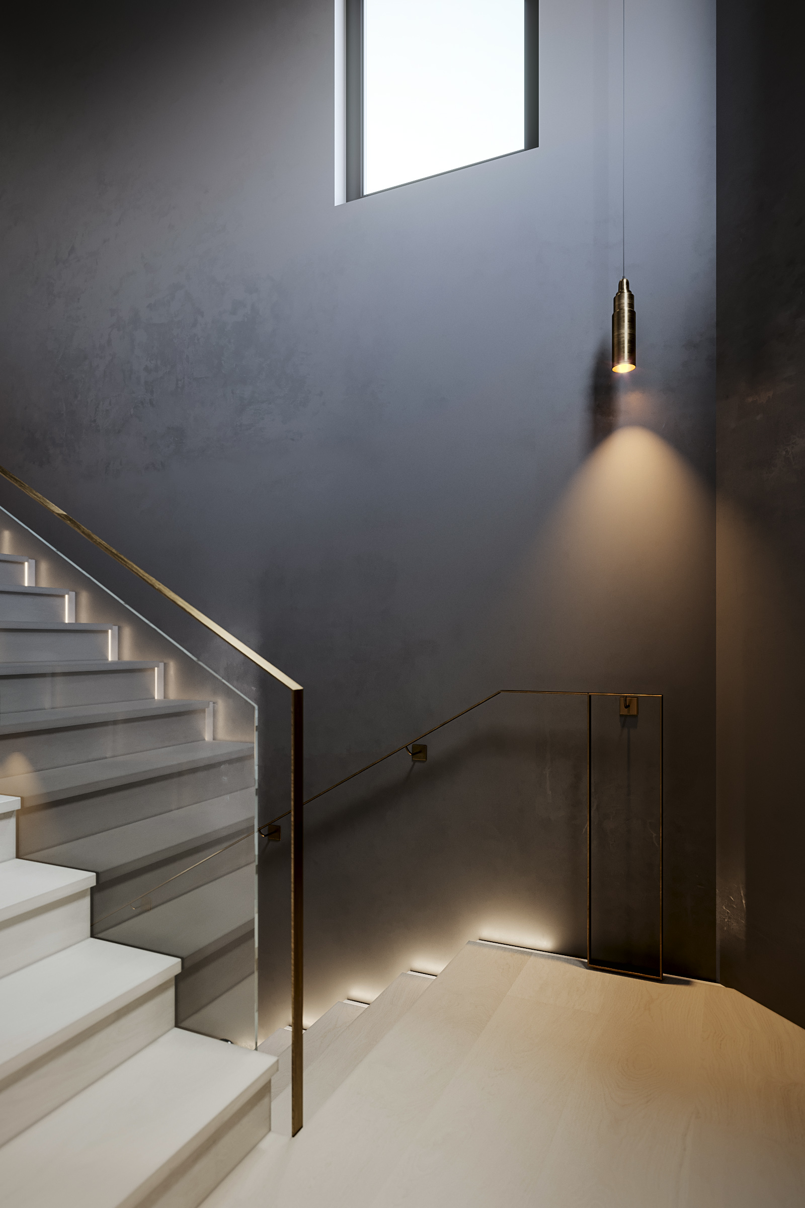 Stairs from the ground floor to first, from main hall and living room to bedrooms. On the walls grey plaster and white paint, on a floor and ceiling geometry made by bronze profile