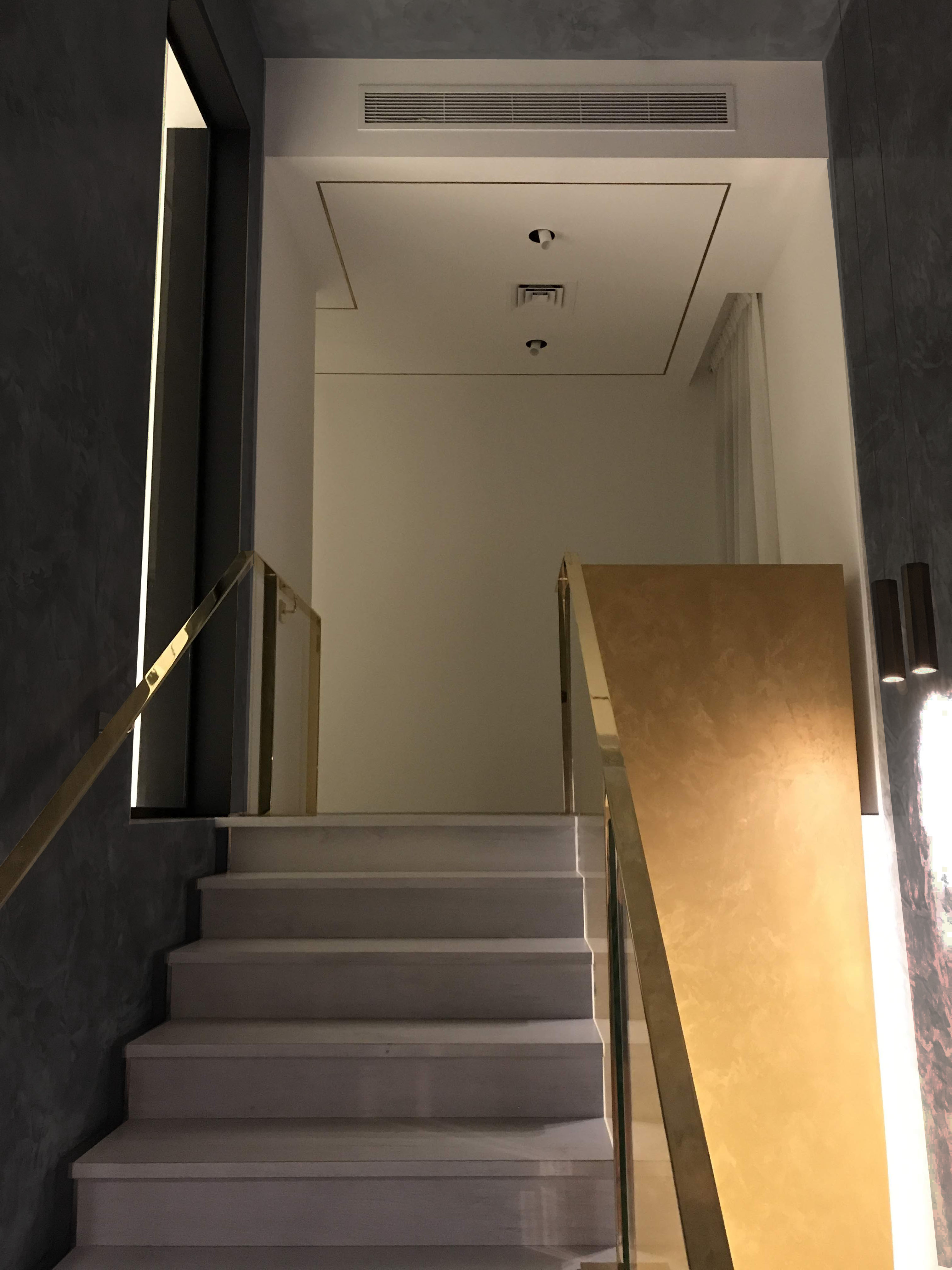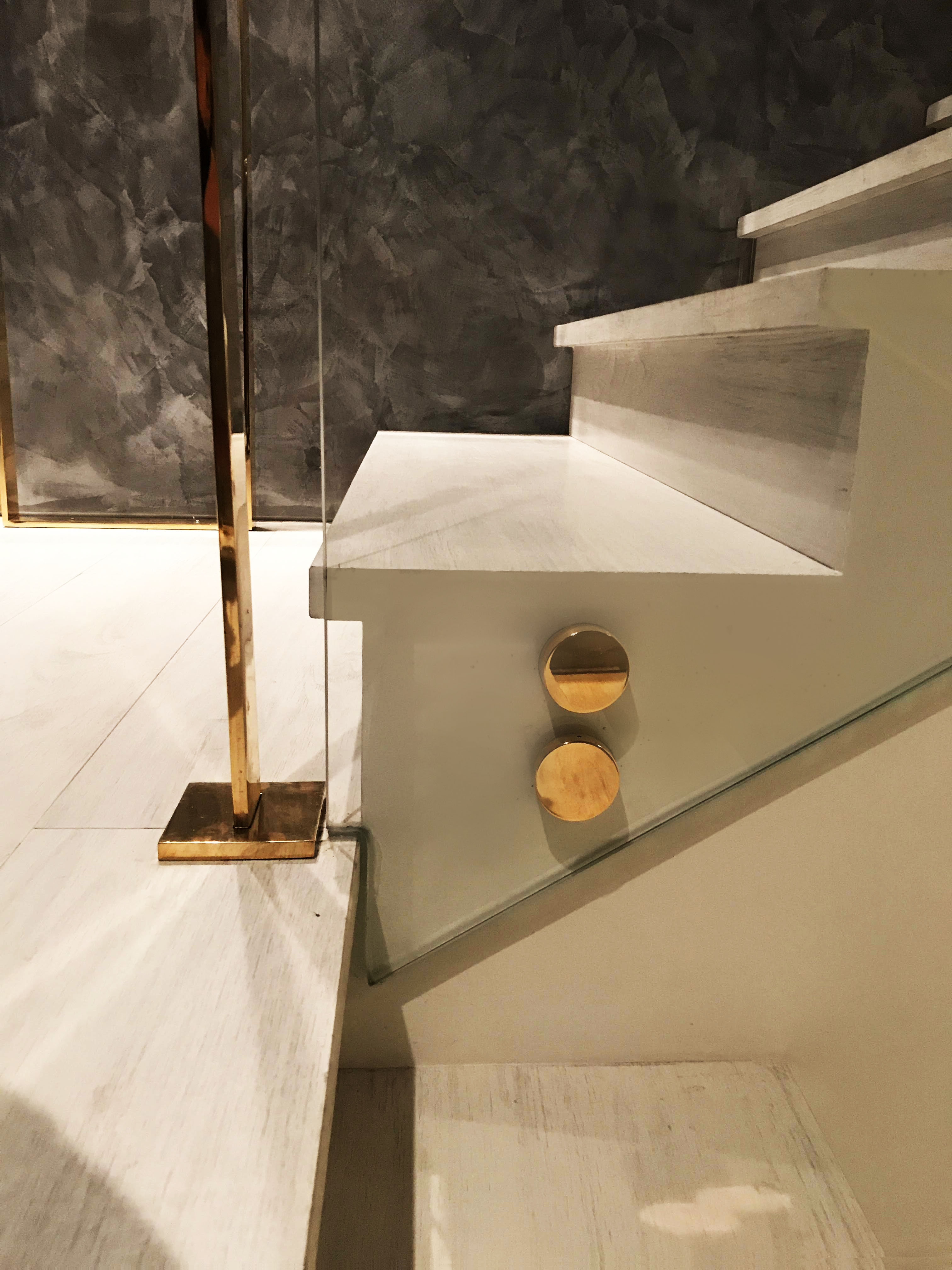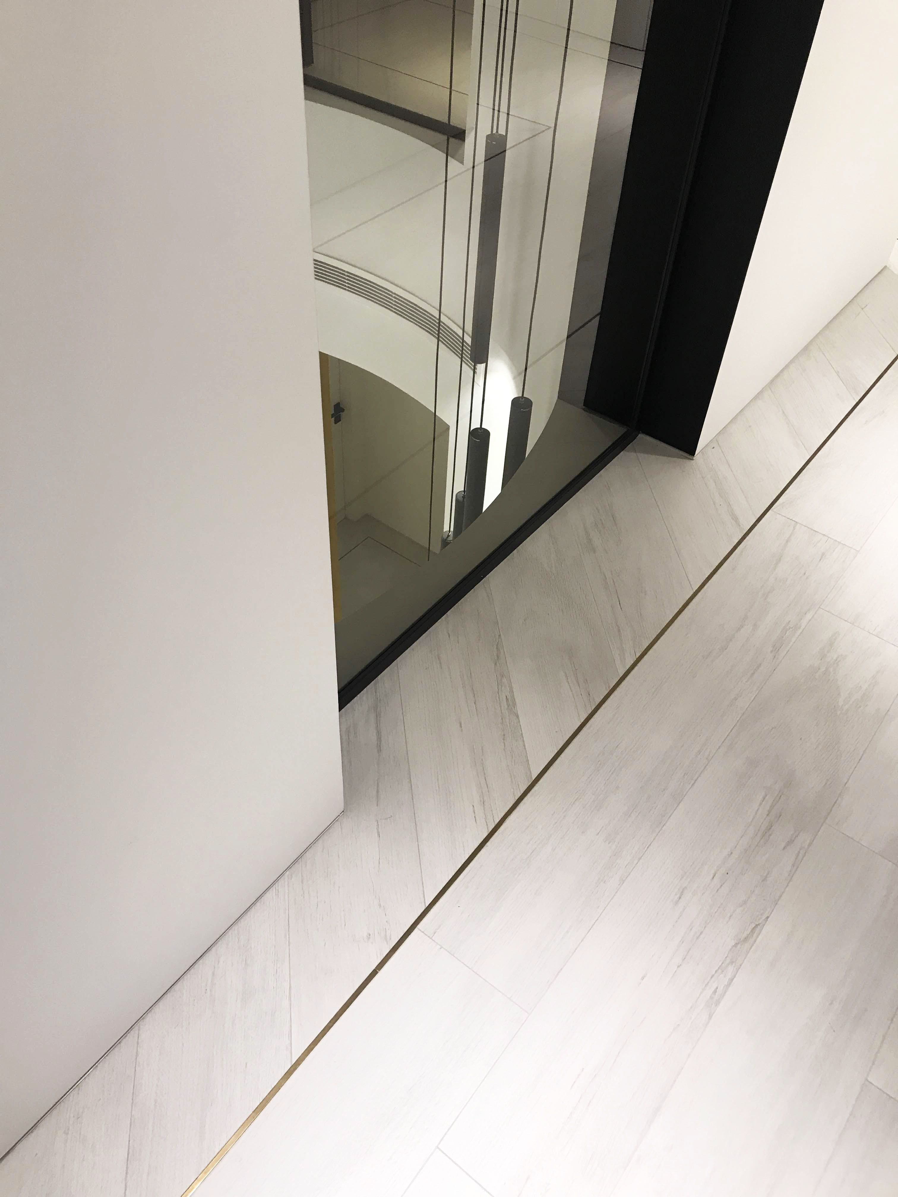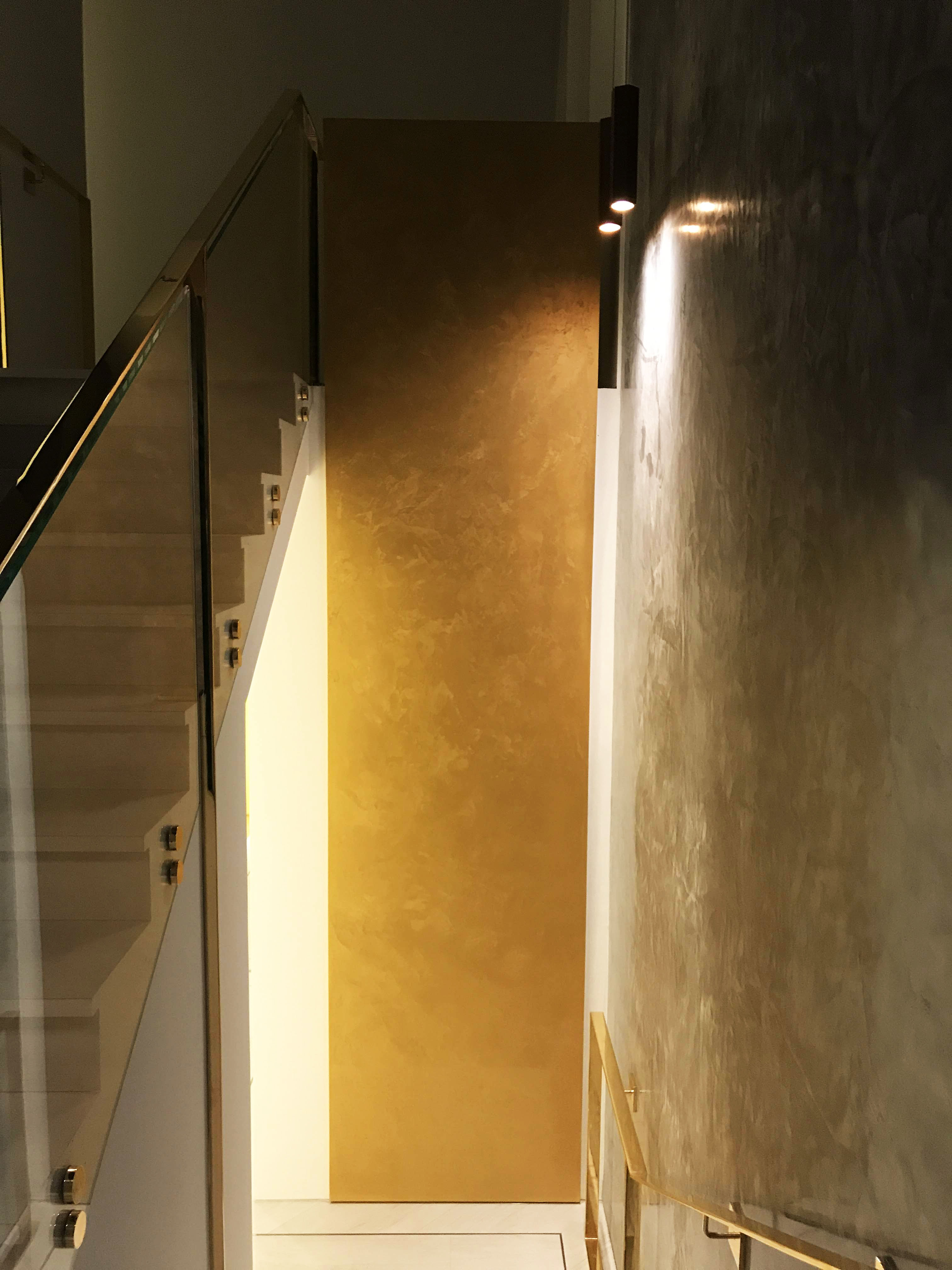 Stairs from the ground floor to first, from main hall and living room to bedrooms. On the walls grey plaster and white paint, on a floor and ceiling geometry made by bronze profile