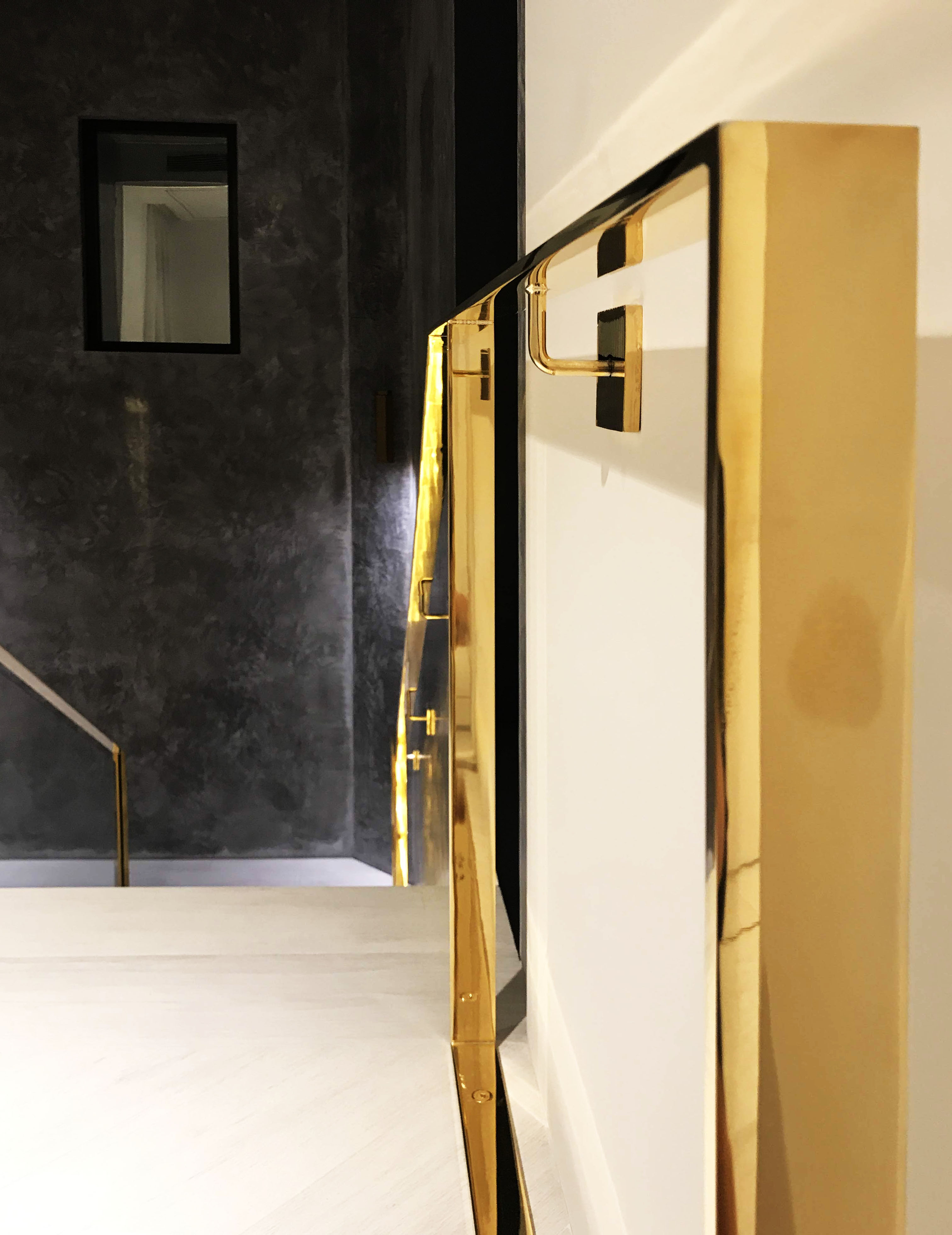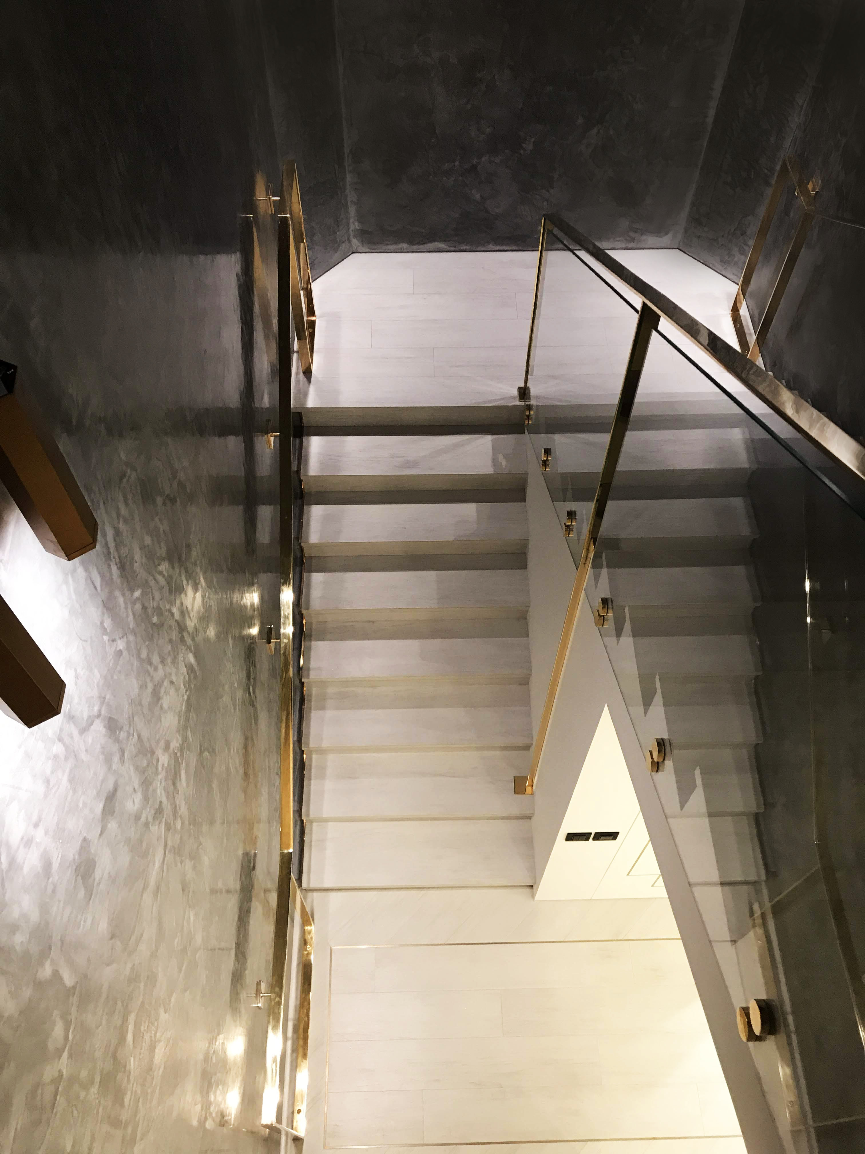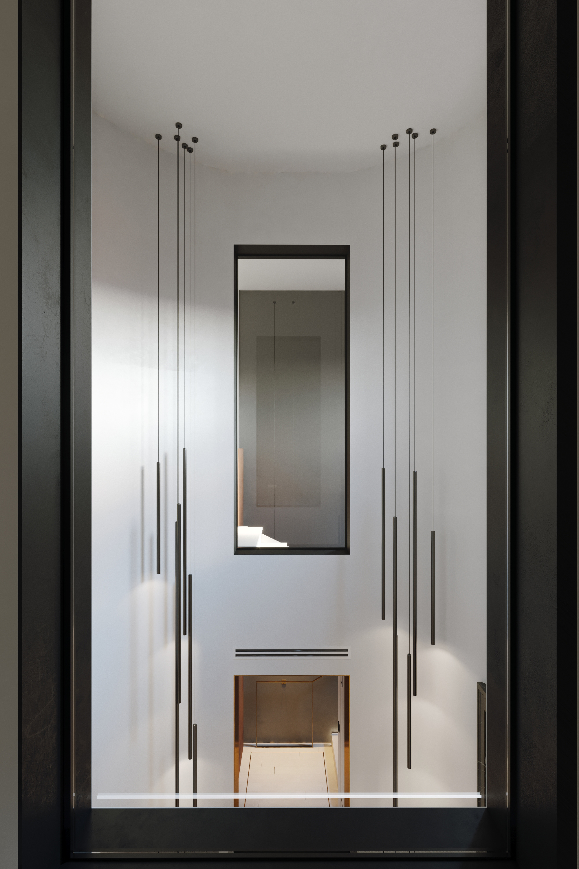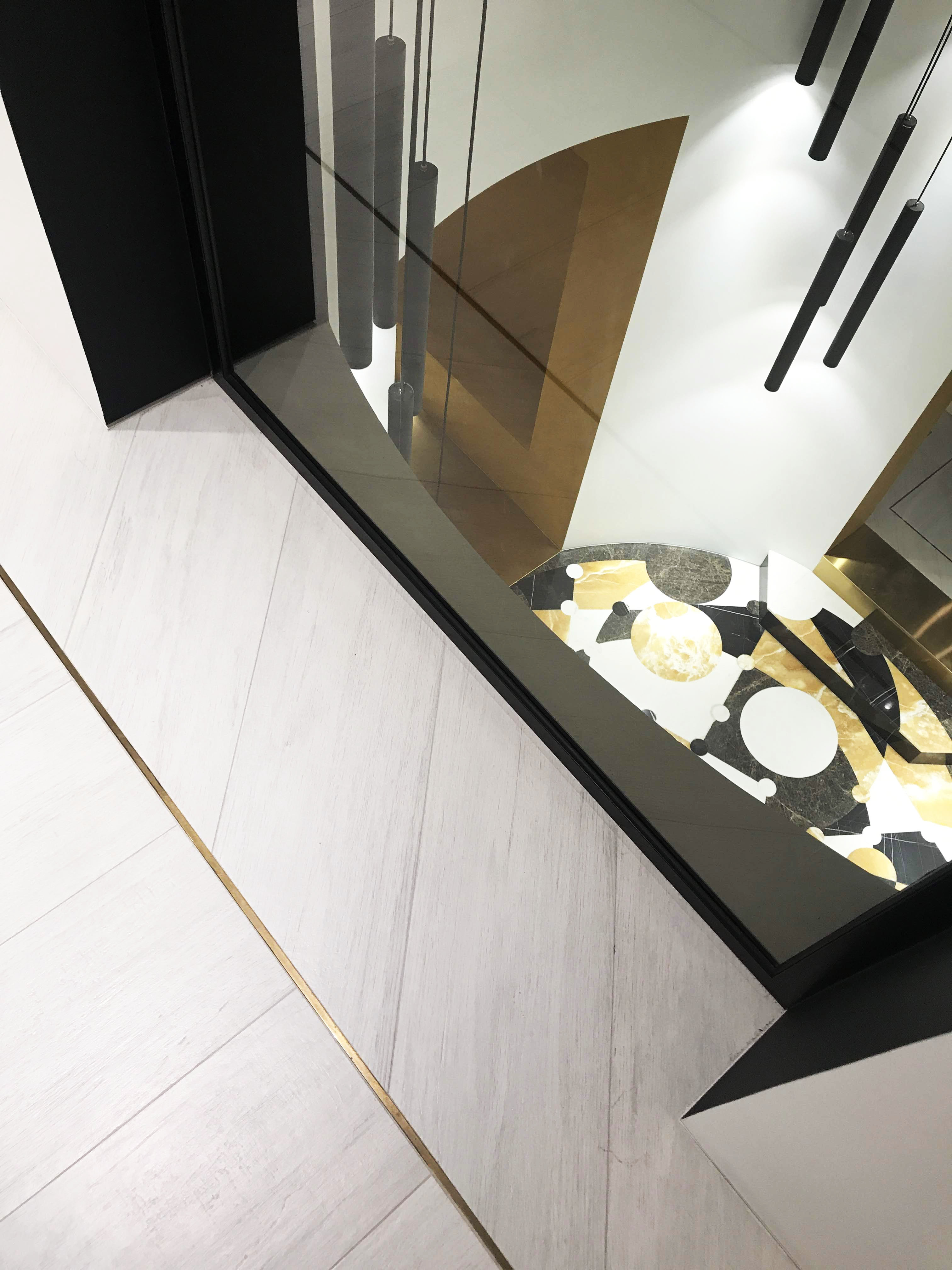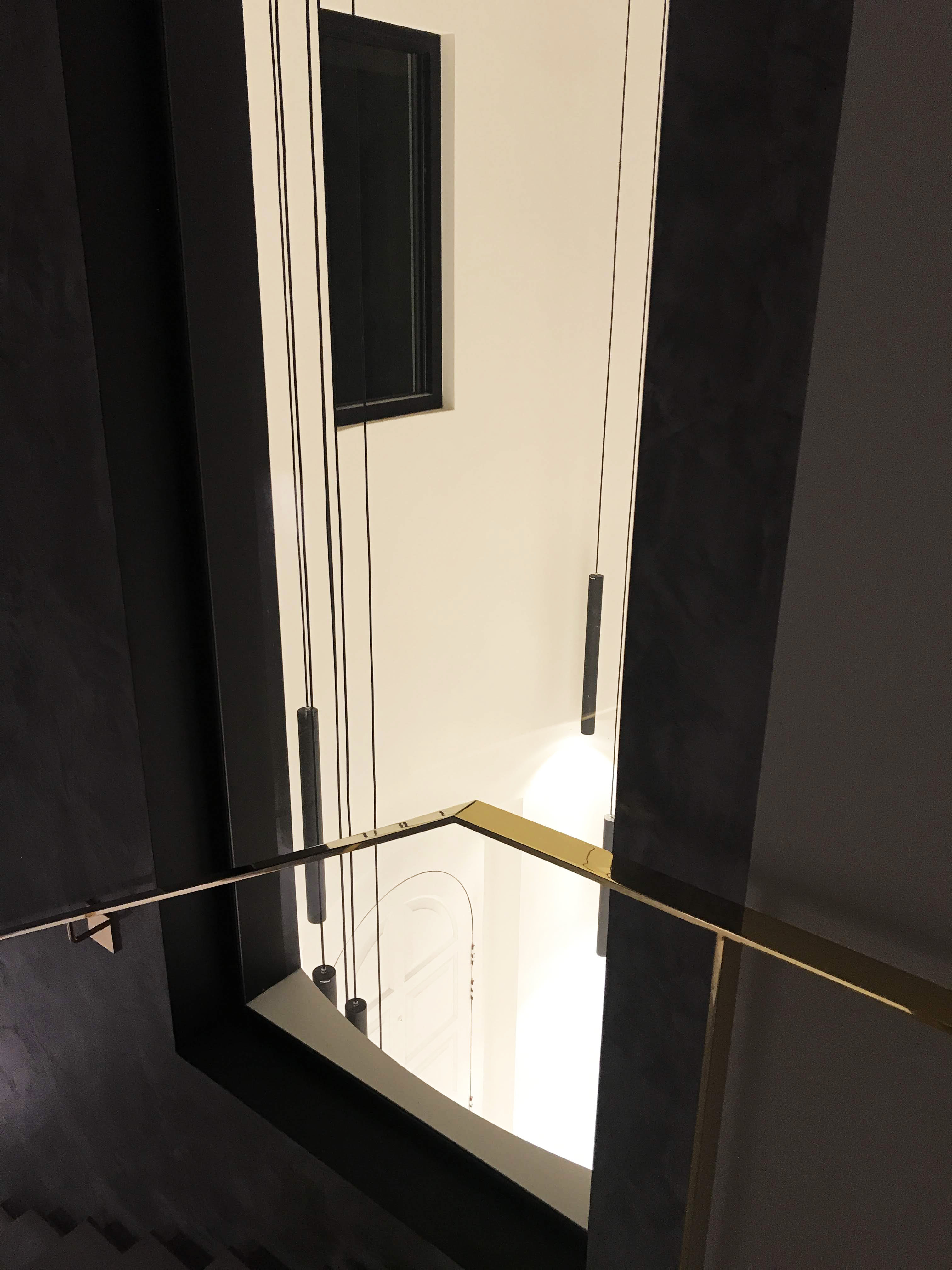 Stairs from the ground floor to first, from main hall and living room to bedrooms. On the walls grey plaster and white paint, on a floor and ceiling geometry made by bronze profile