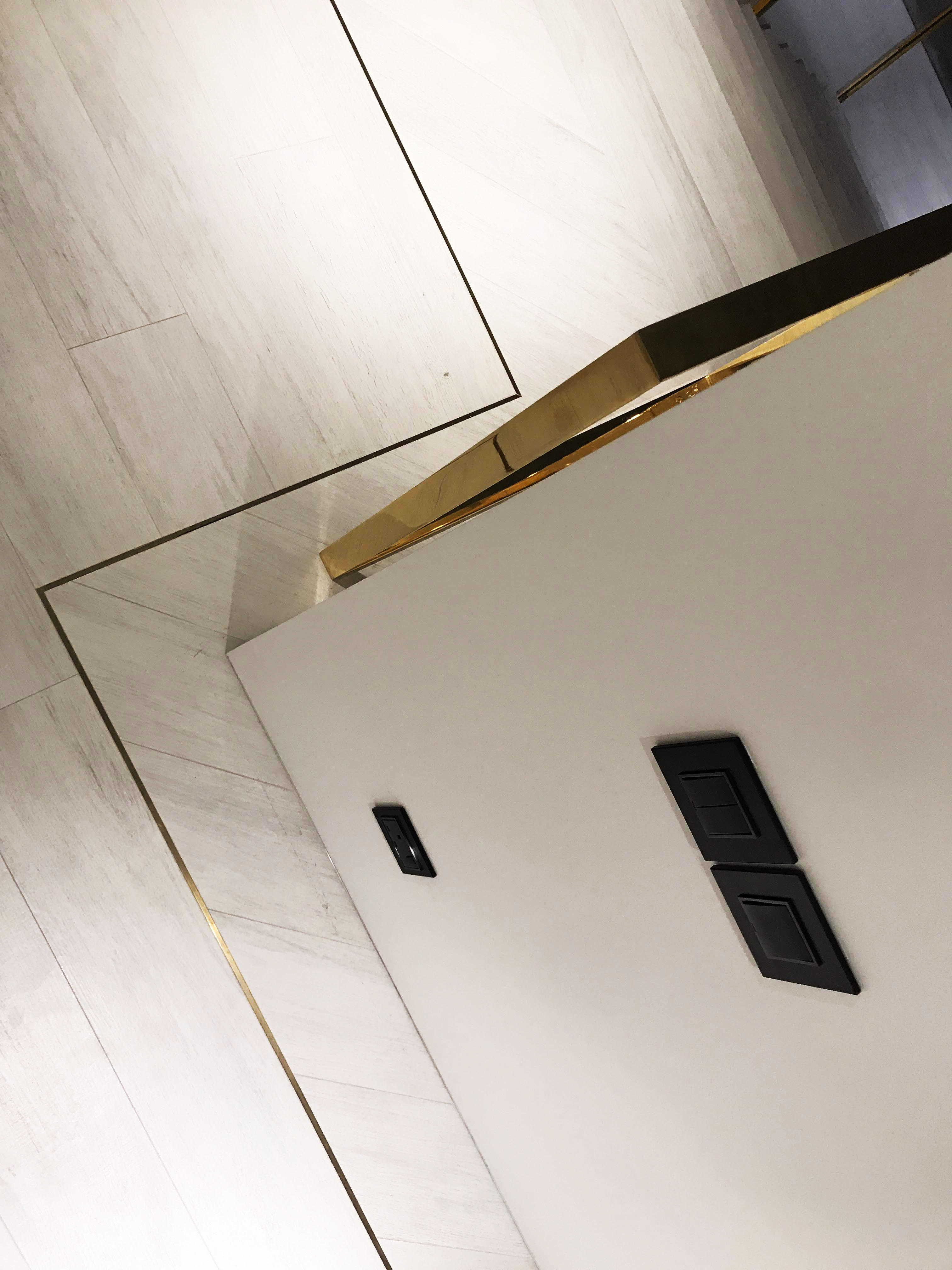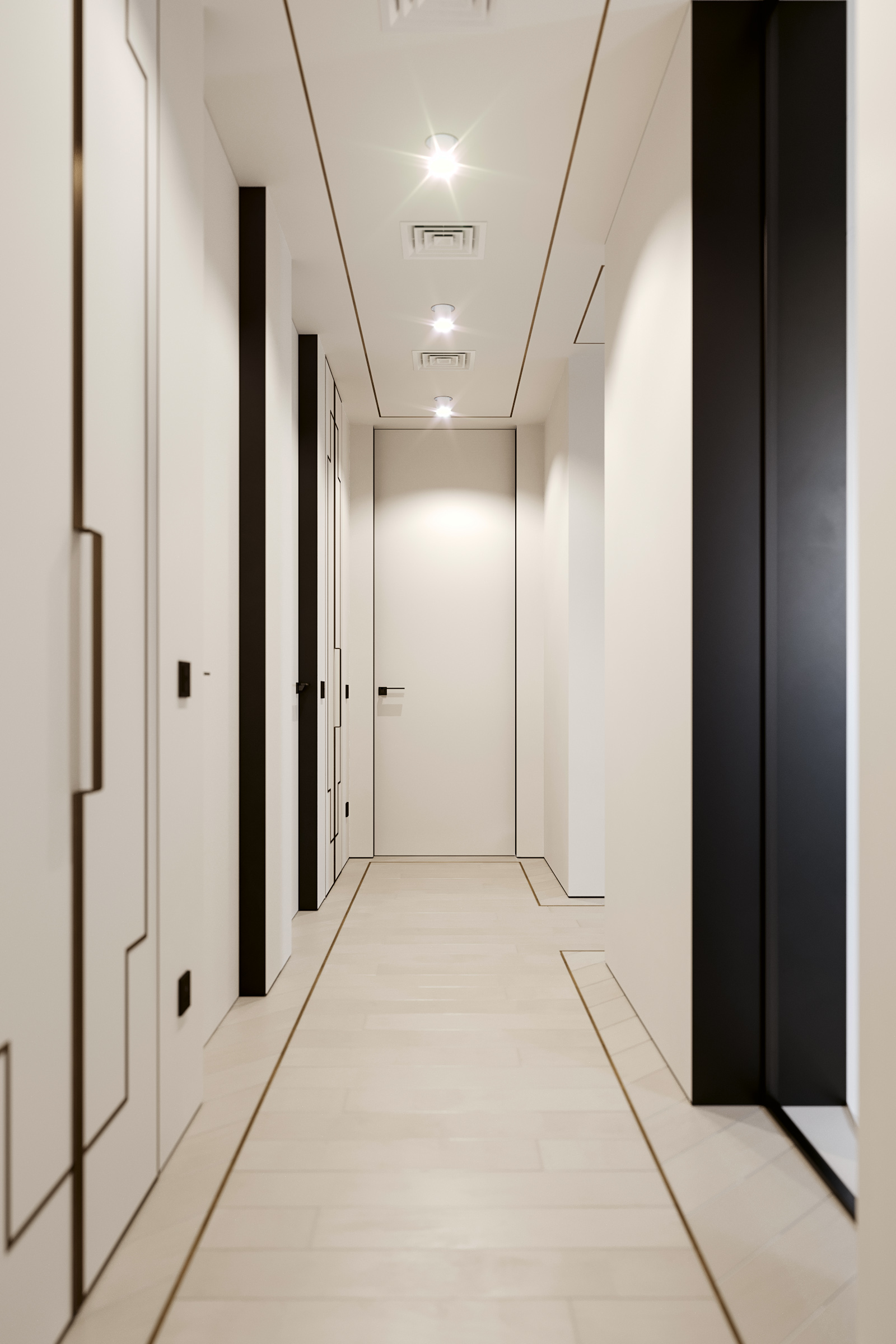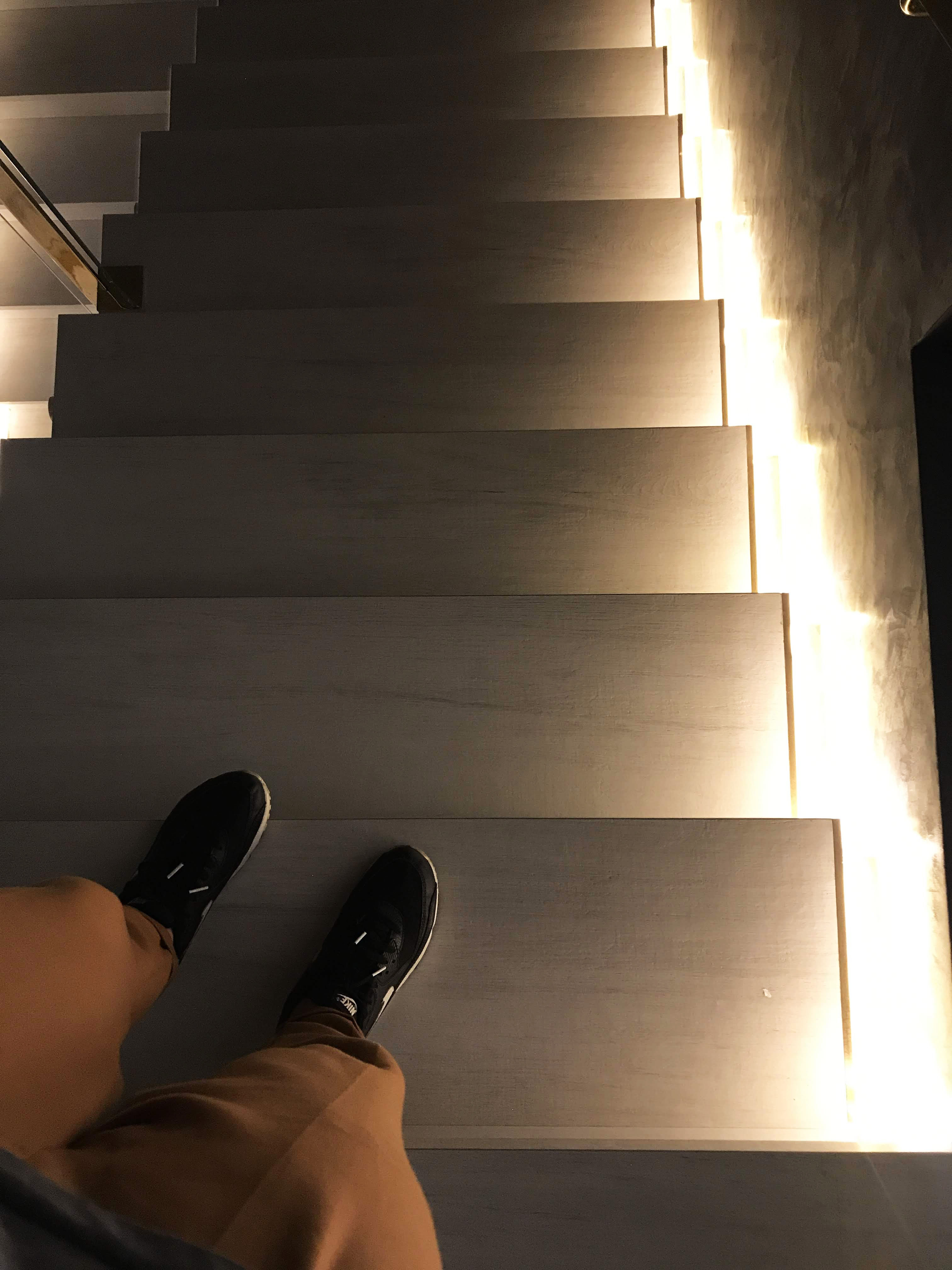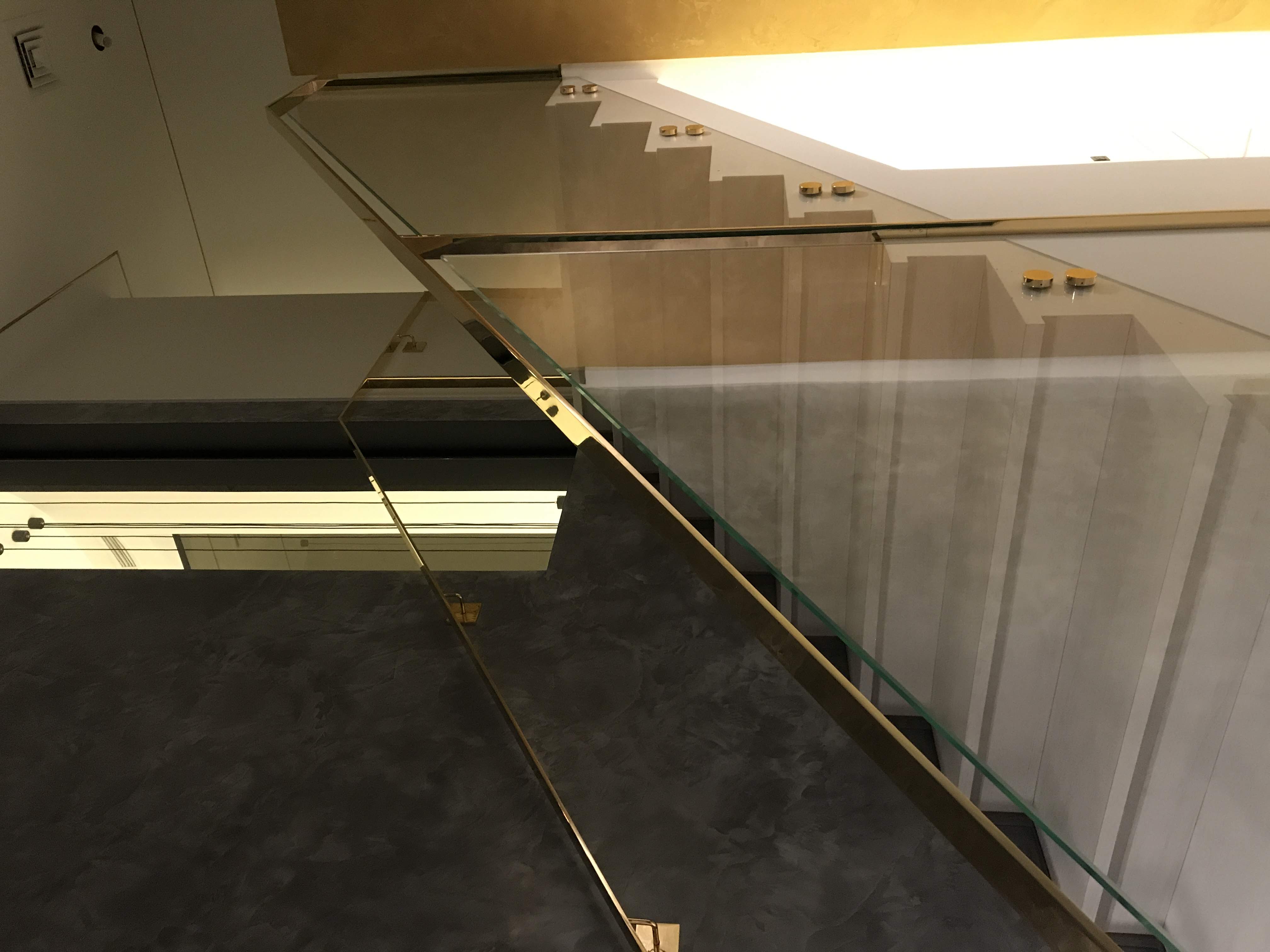 Stairs from the ground floor to first, from main hall and living room to bedrooms. On the walls grey plaster and white paint, on a floor and ceiling geometry made by bronze profile