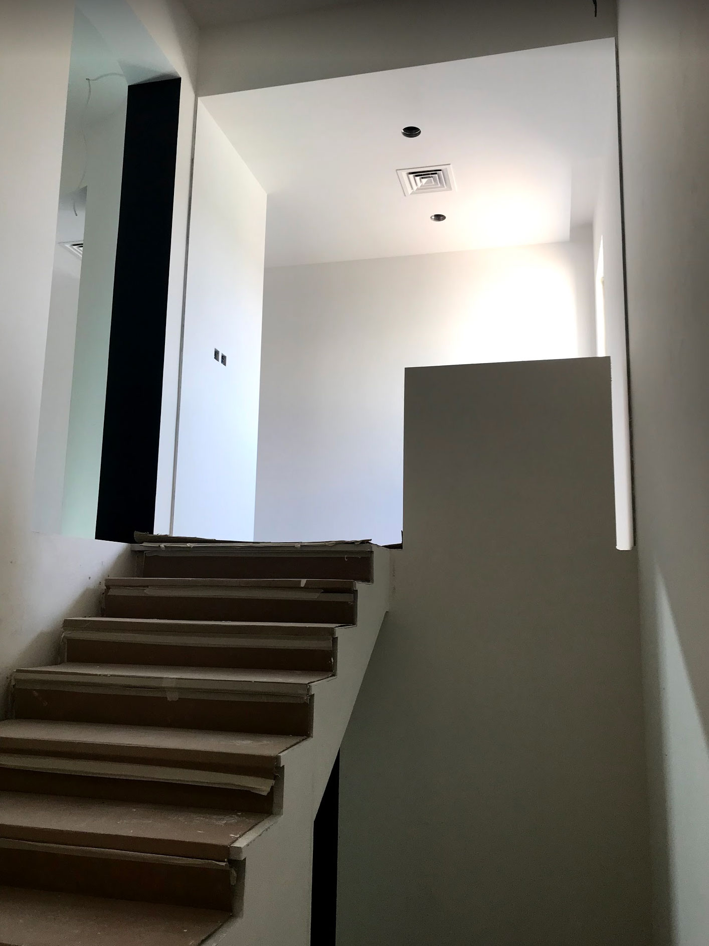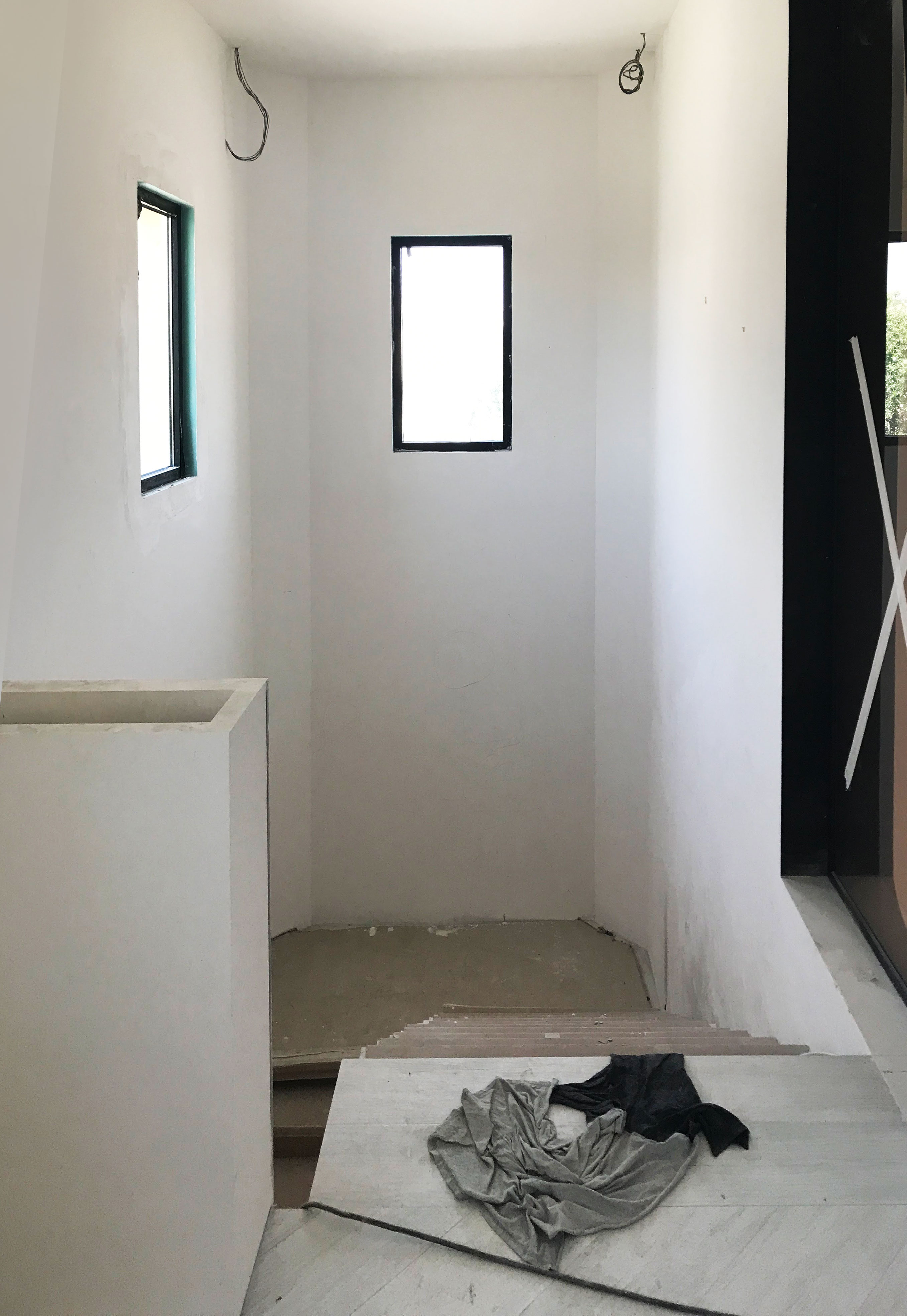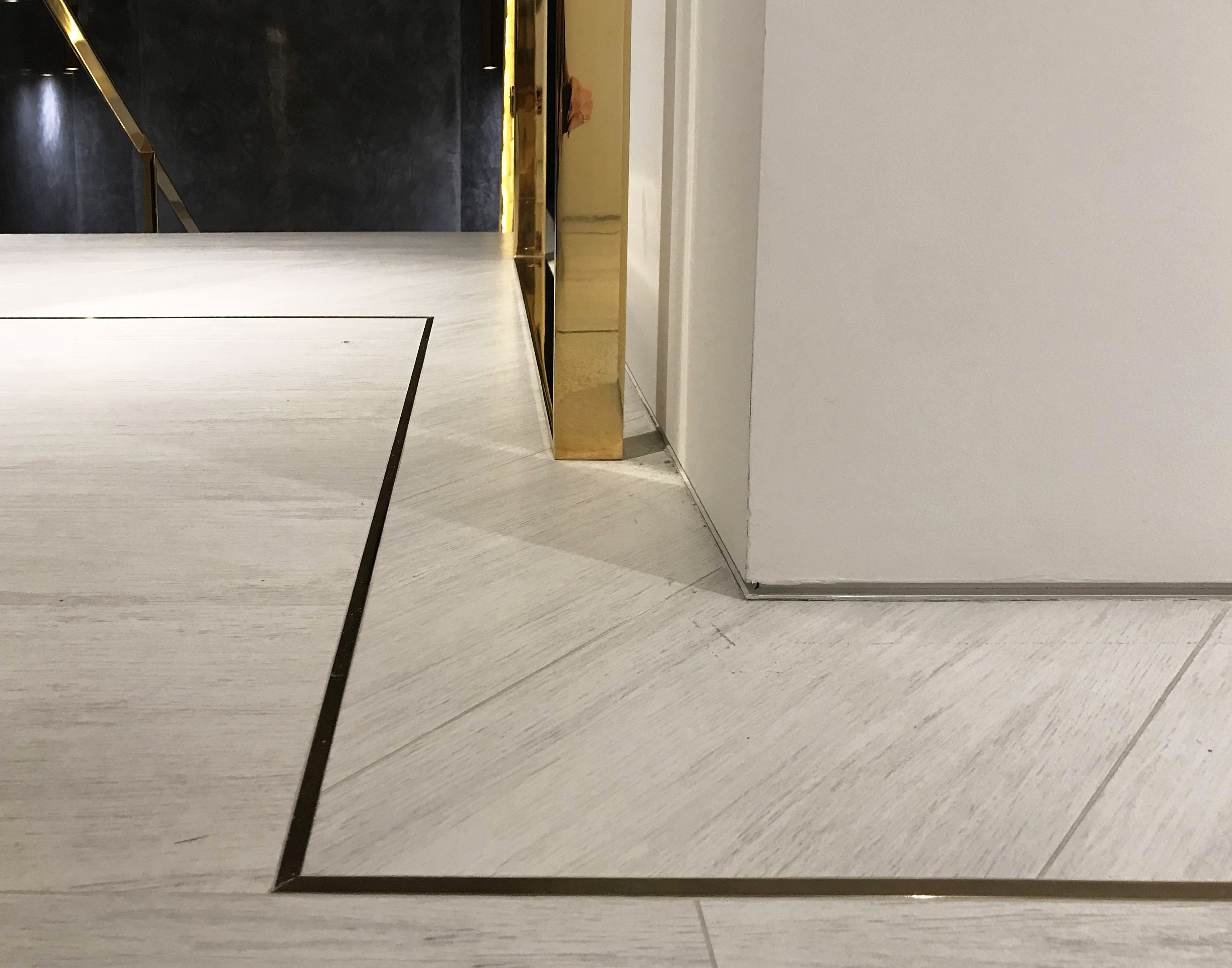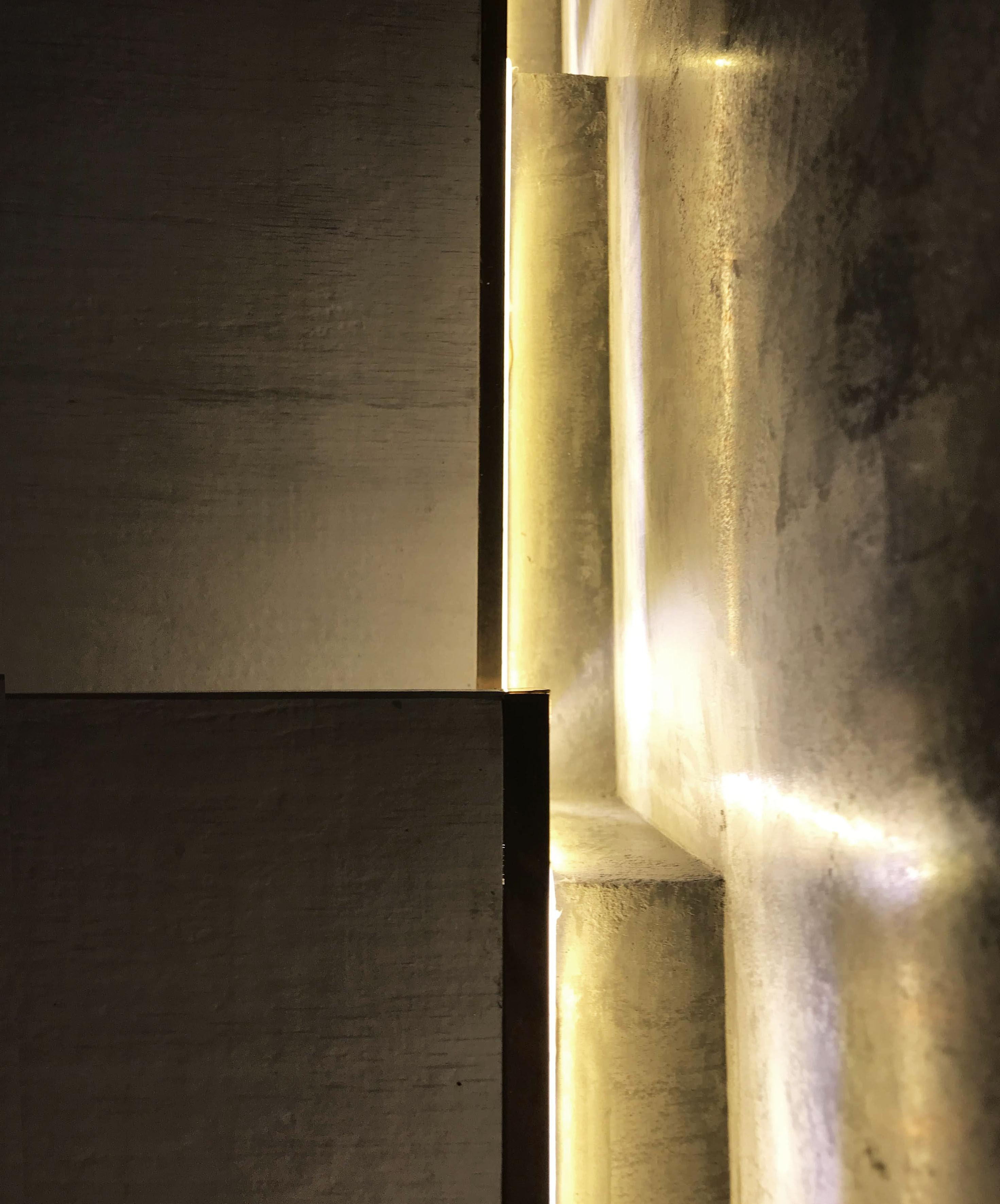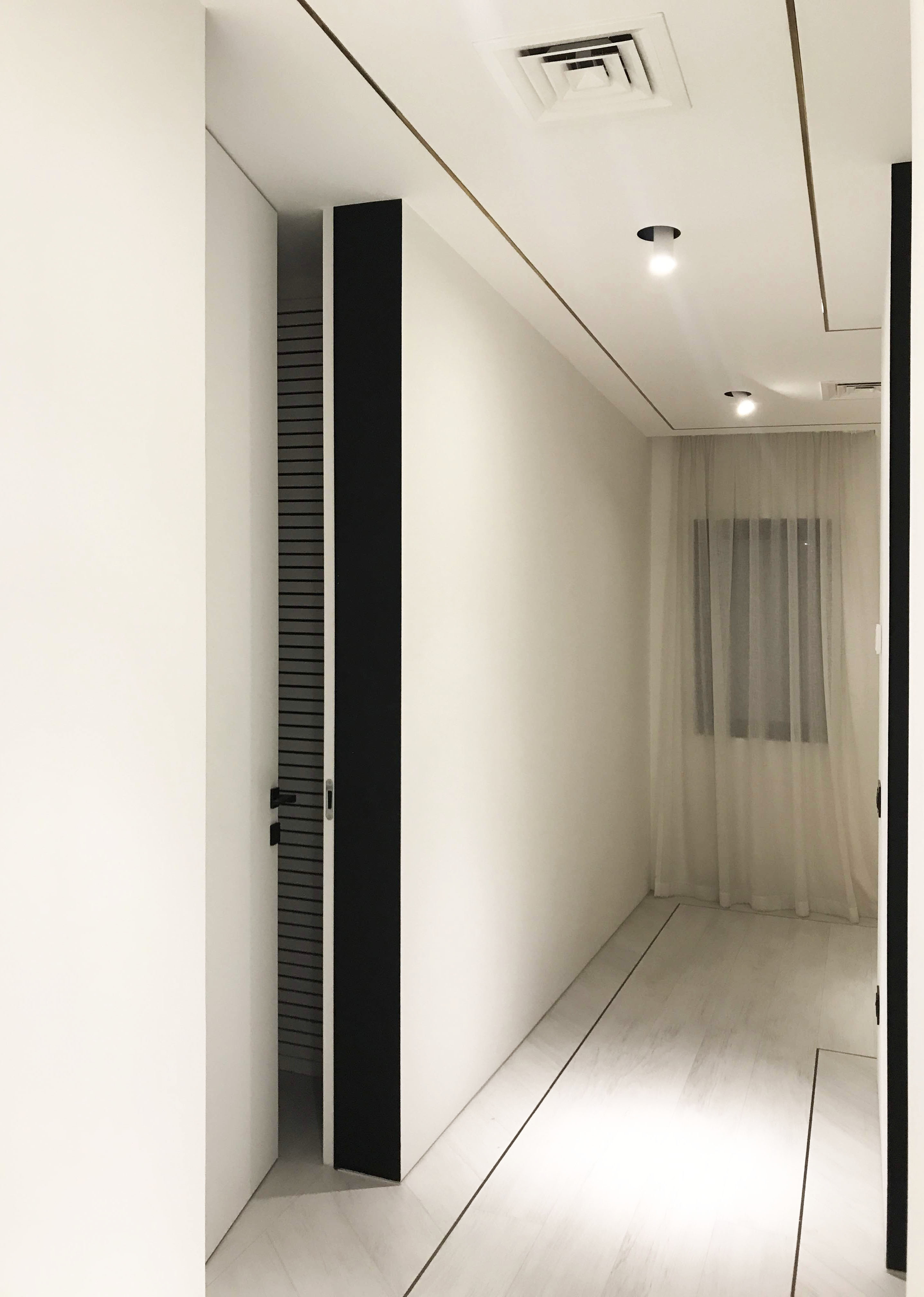 Stairs from the ground floor to first, from main hall and living room to bedrooms. On the walls grey plaster and white paint, on a floor and ceiling geometry made by bronze profile
