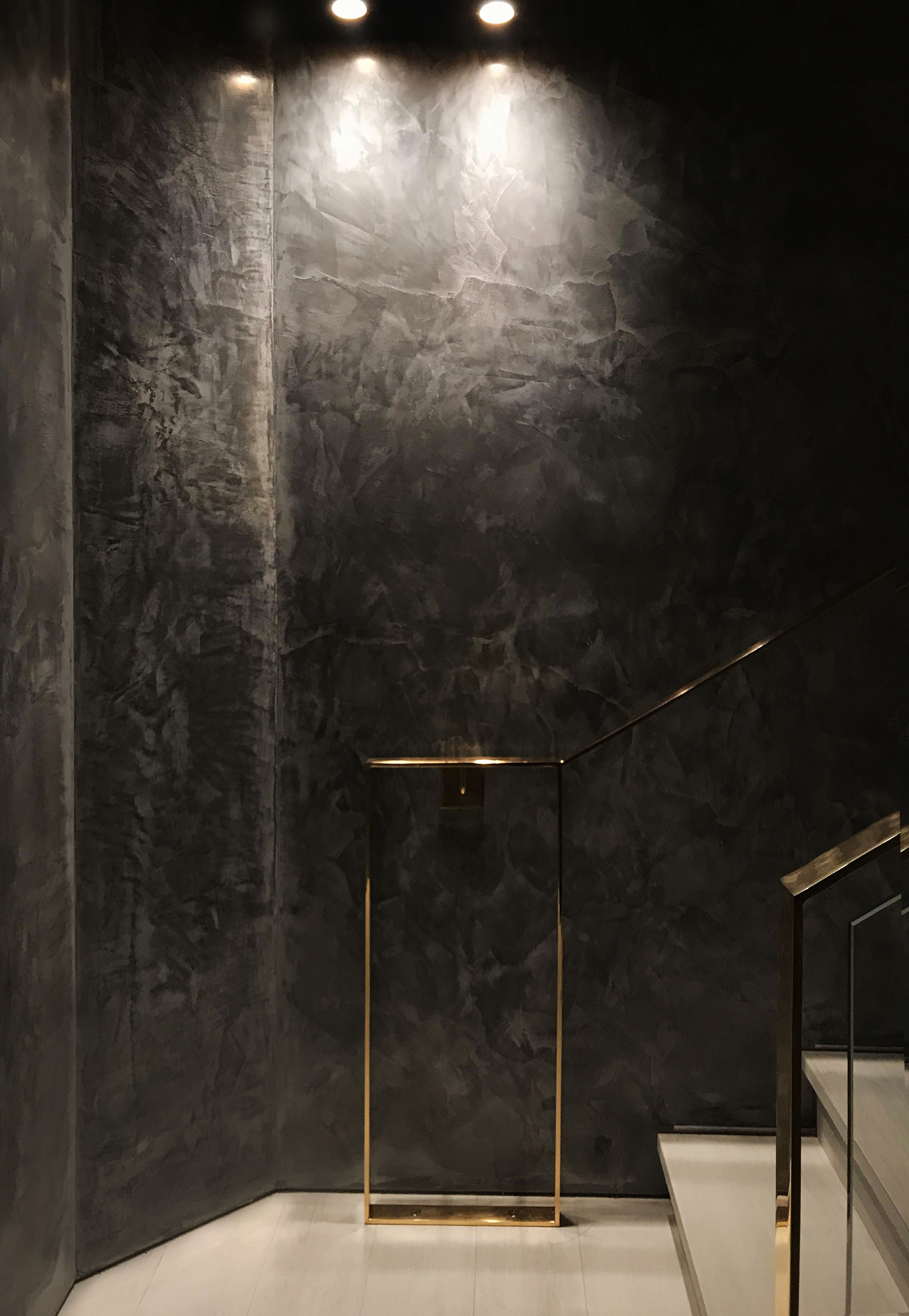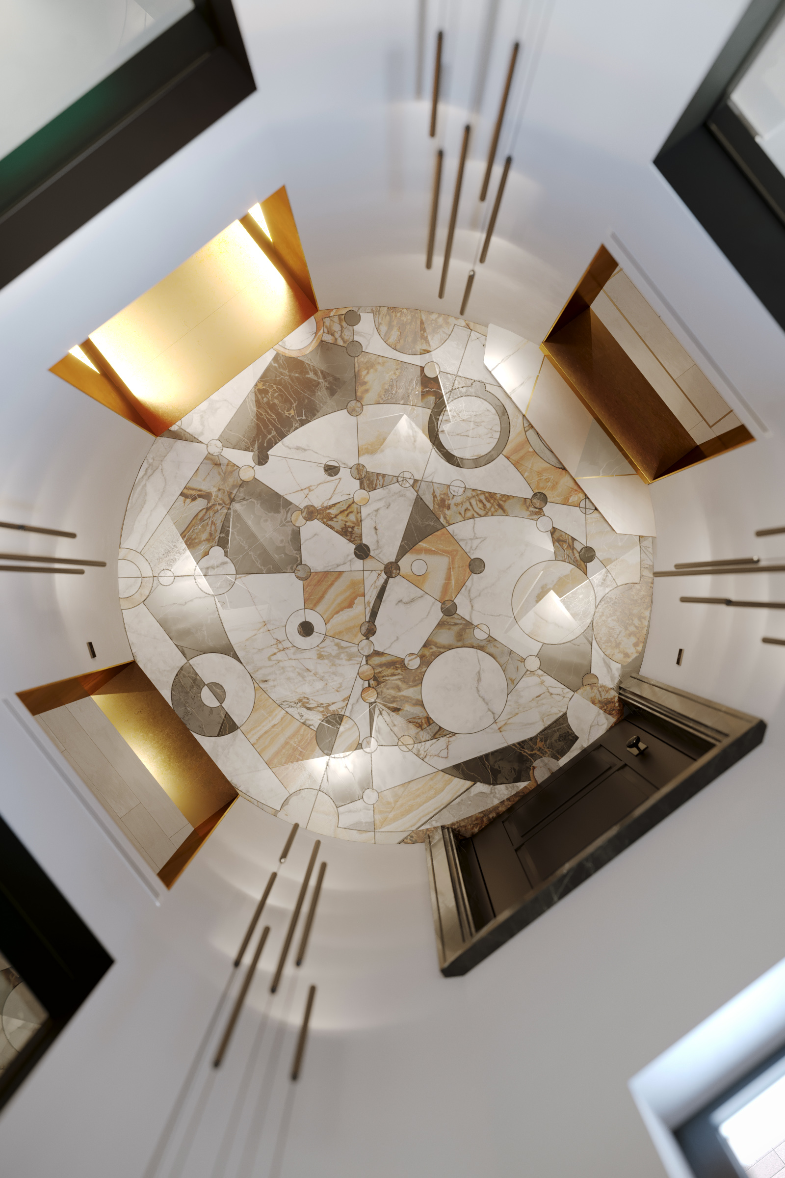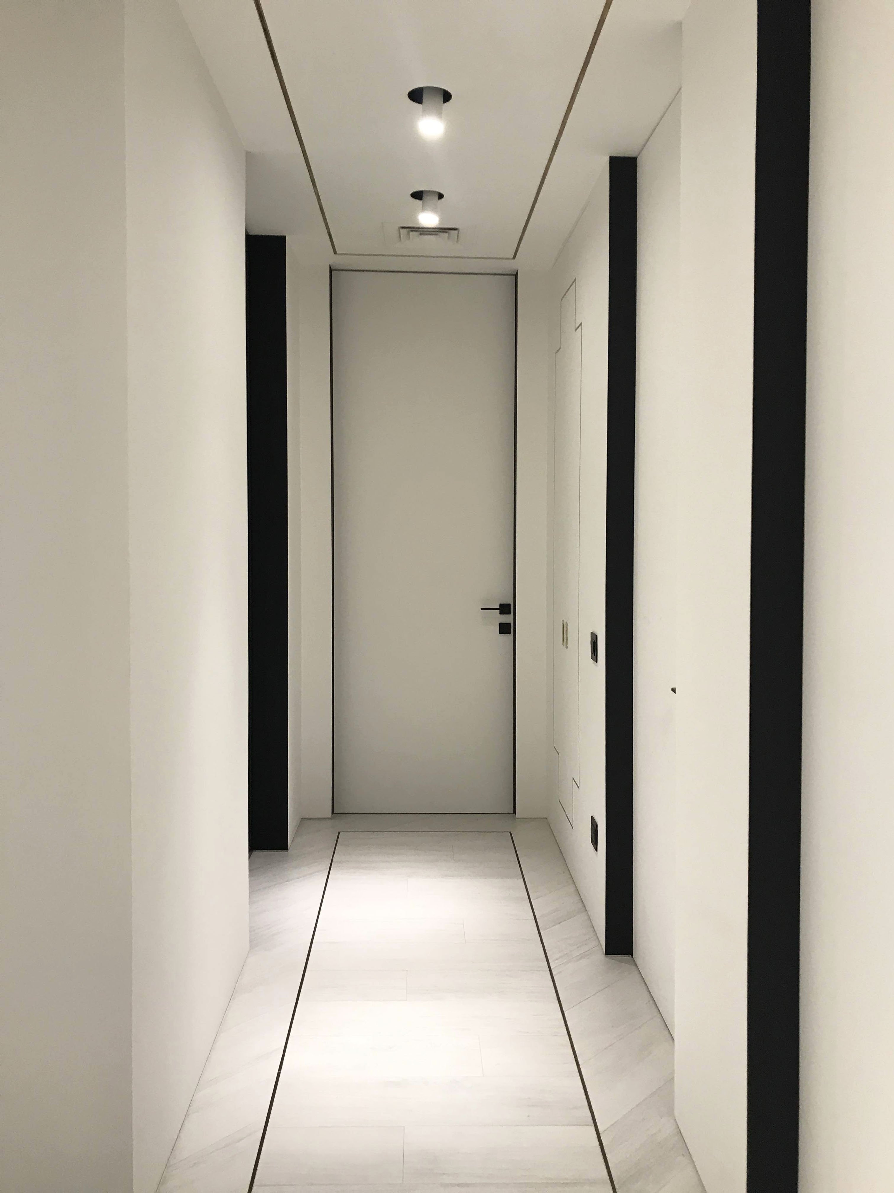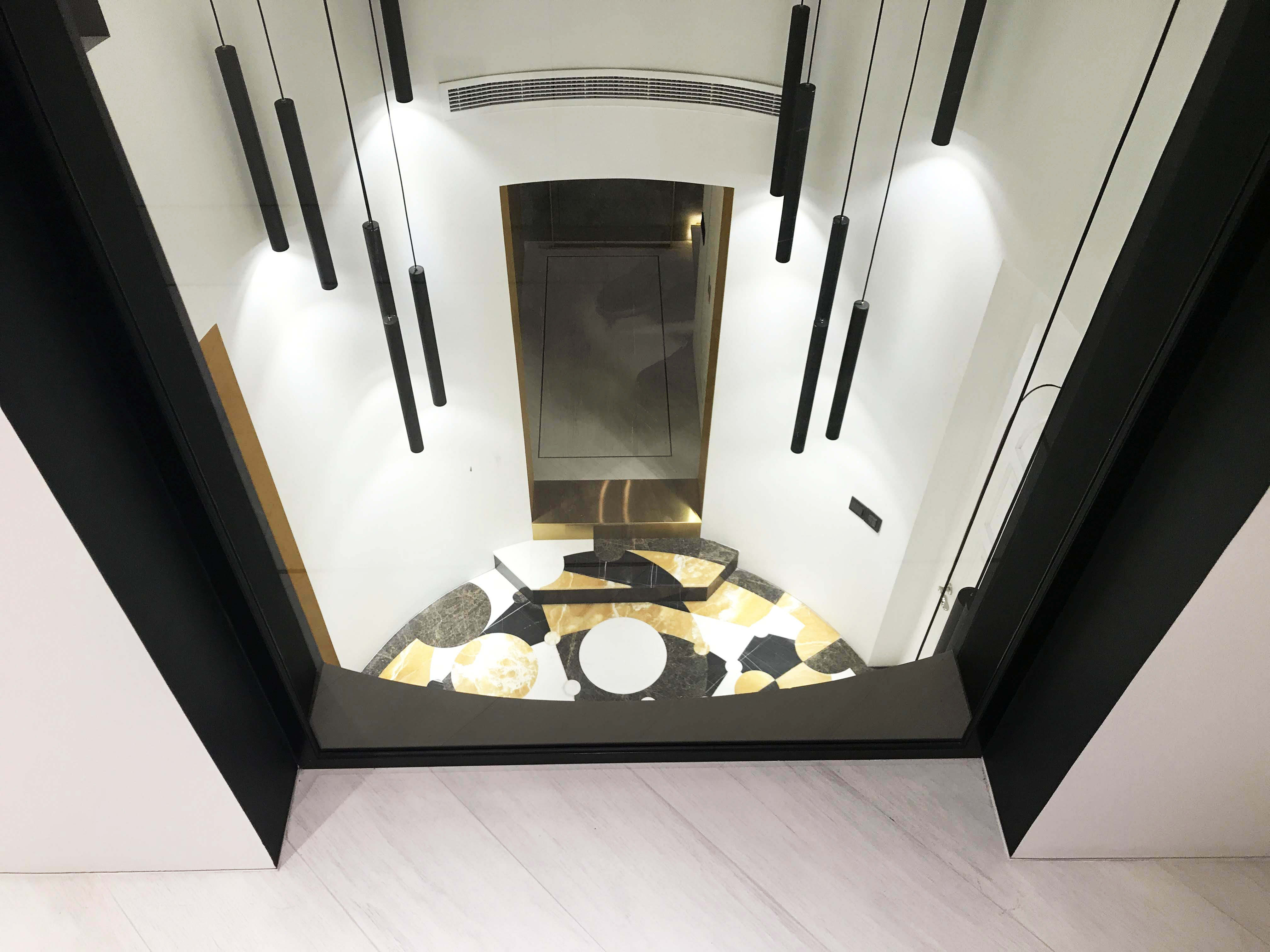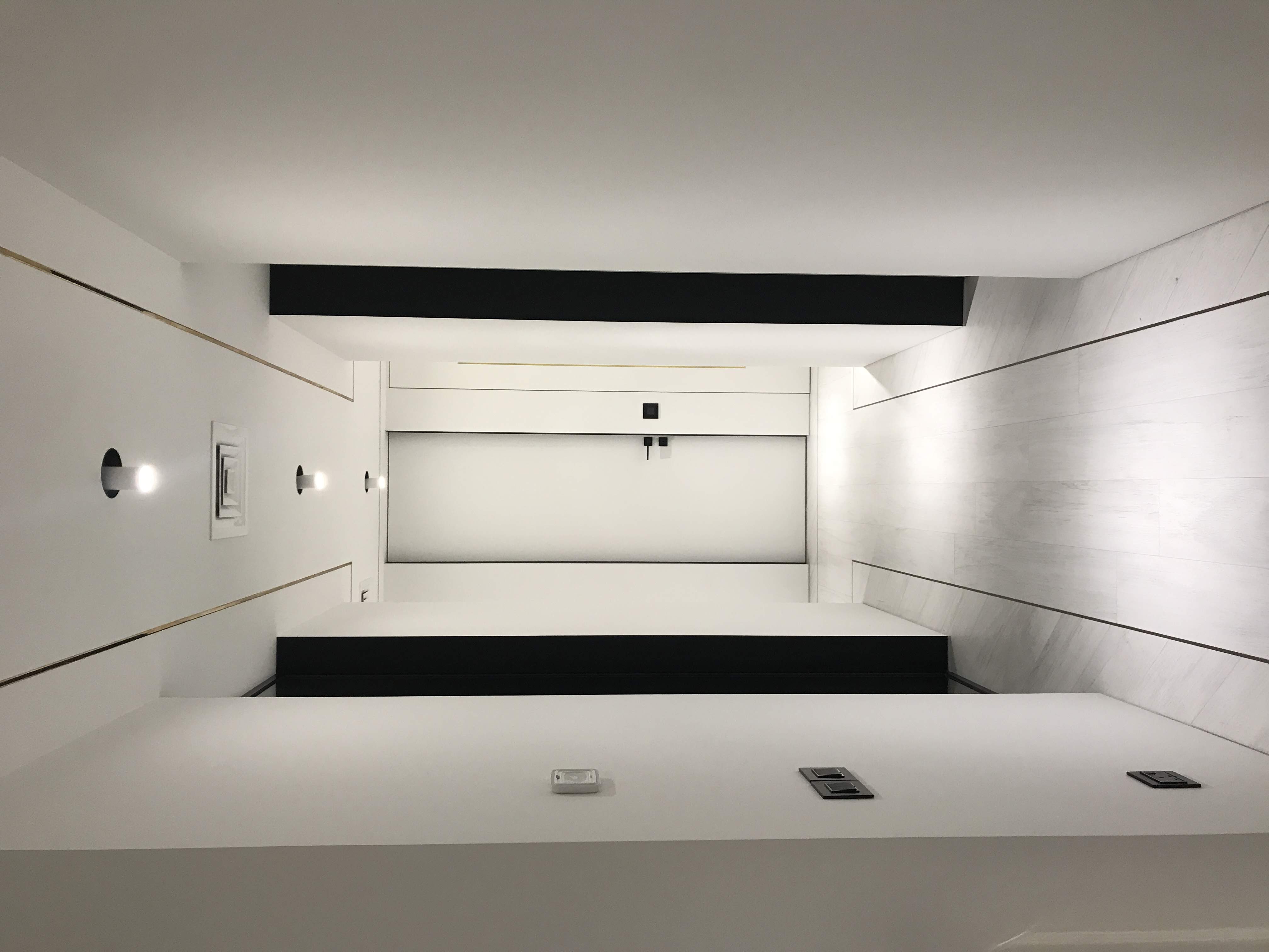Stairs from the ground floor to first, from main hall and living room to bedrooms. On the walls grey plaster and white paint, on a floor and ceiling geometry made by bronze profile