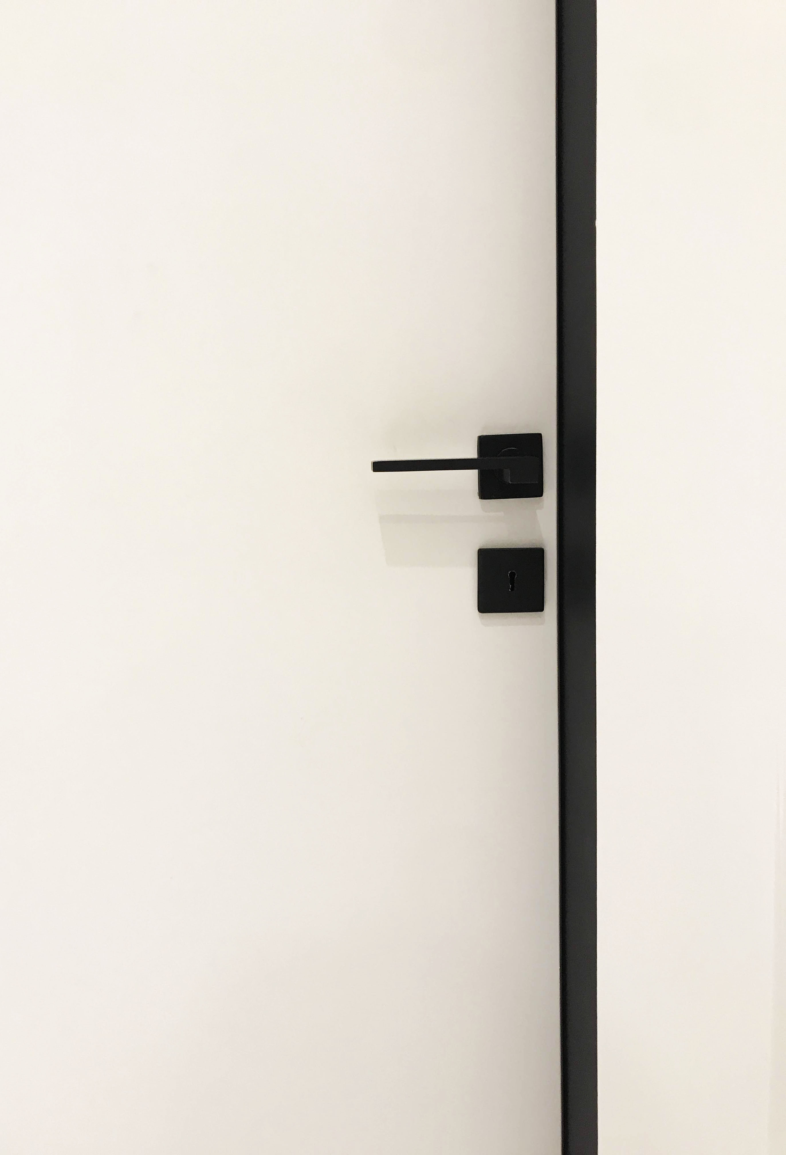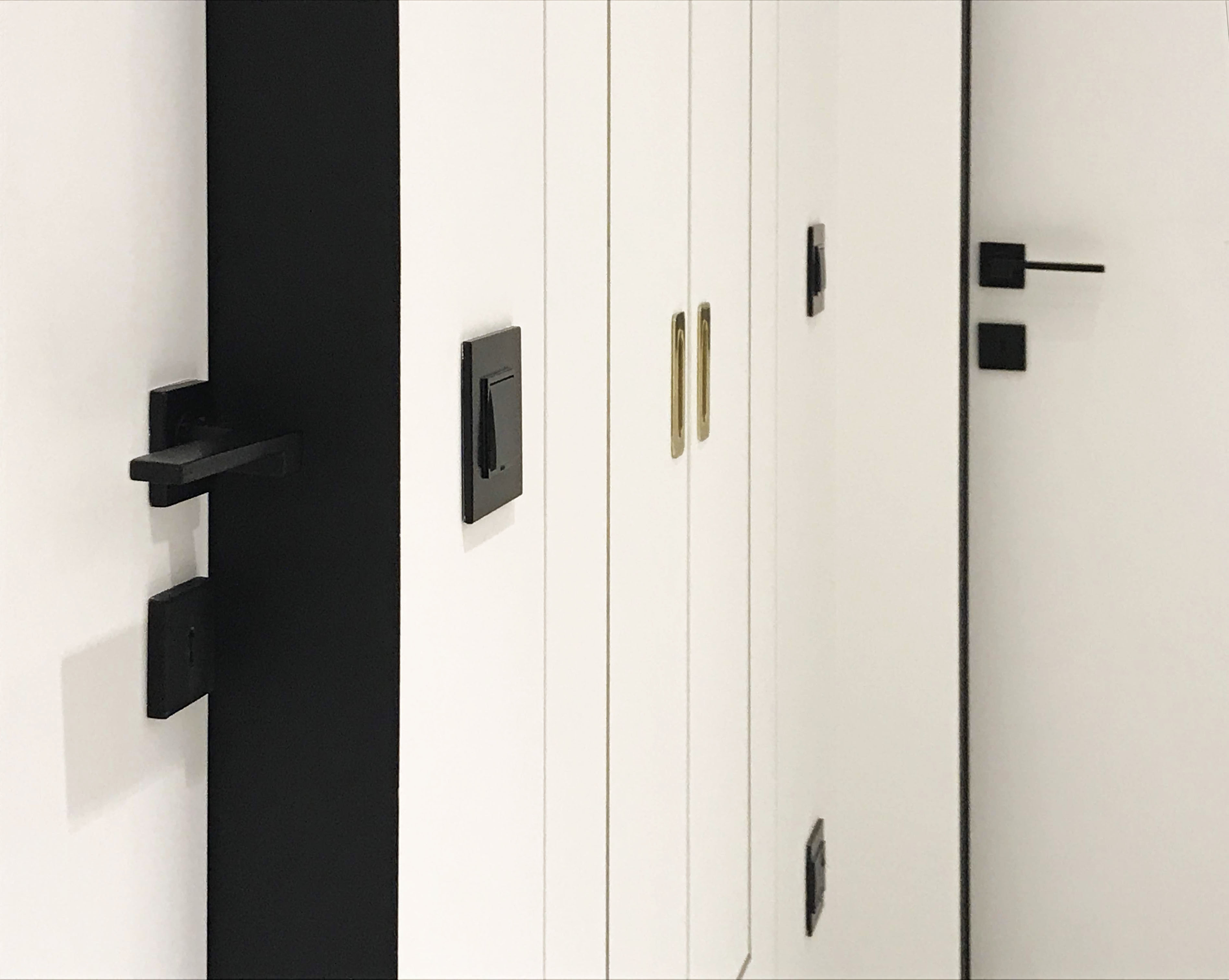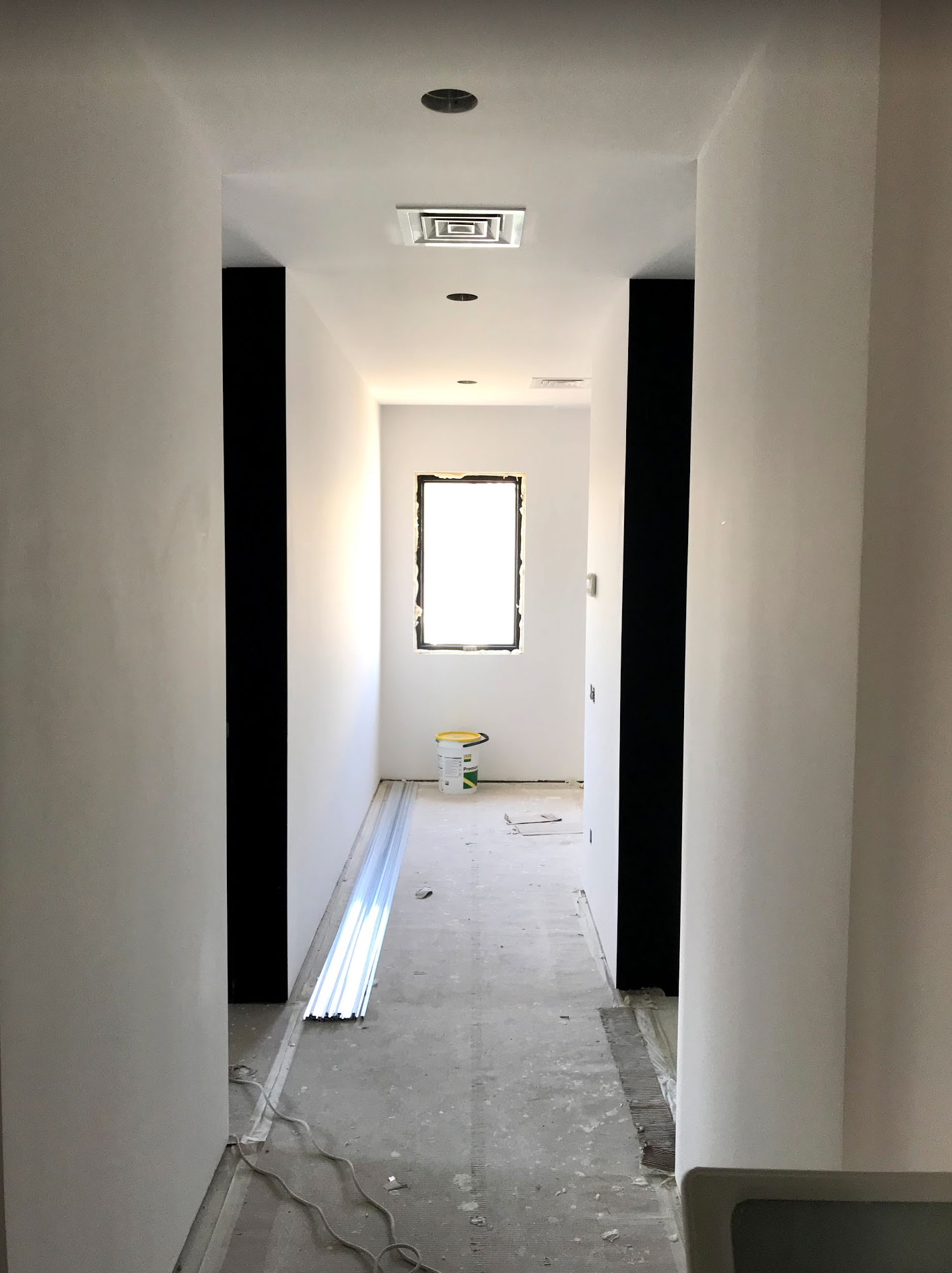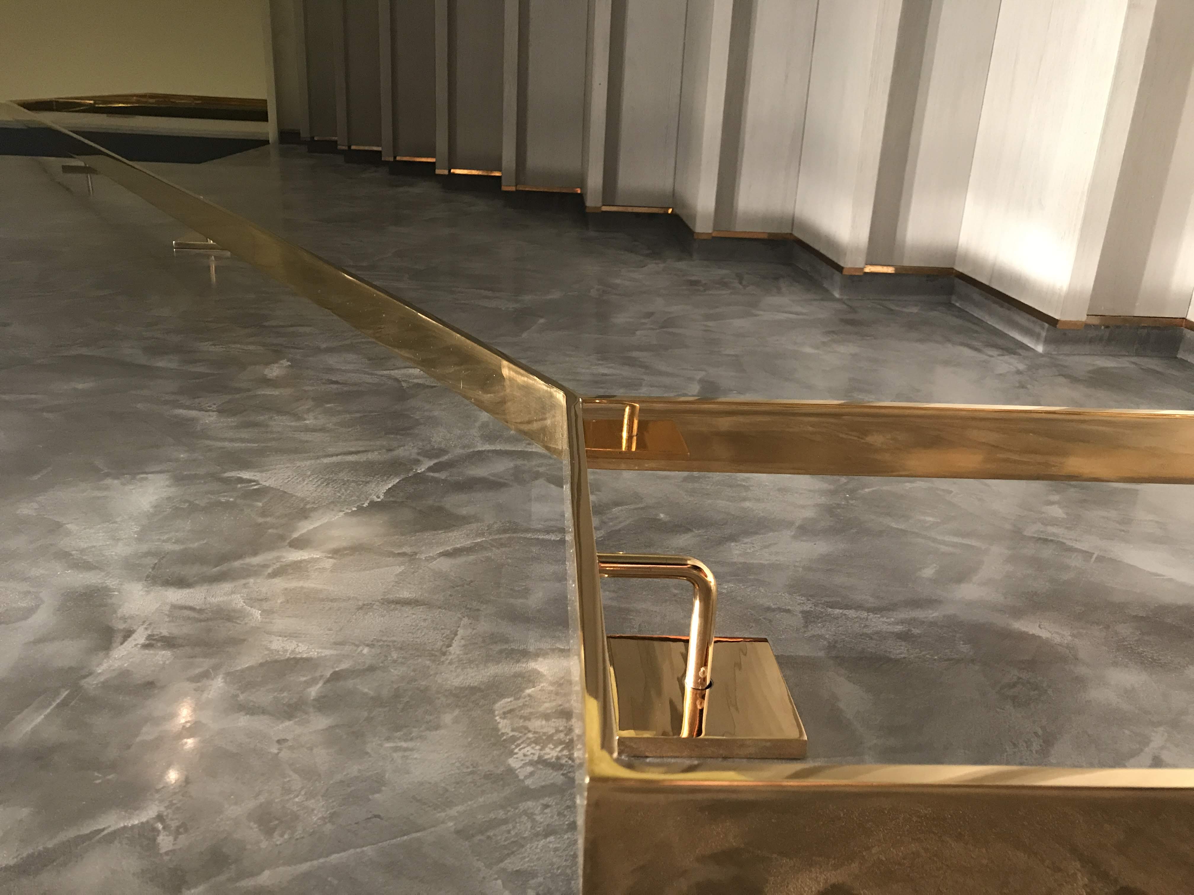 Stairs from the ground floor to first, from main hall and living room to bedrooms. On the walls grey plaster and white paint, on a floor and ceiling geometry made by bronze profile