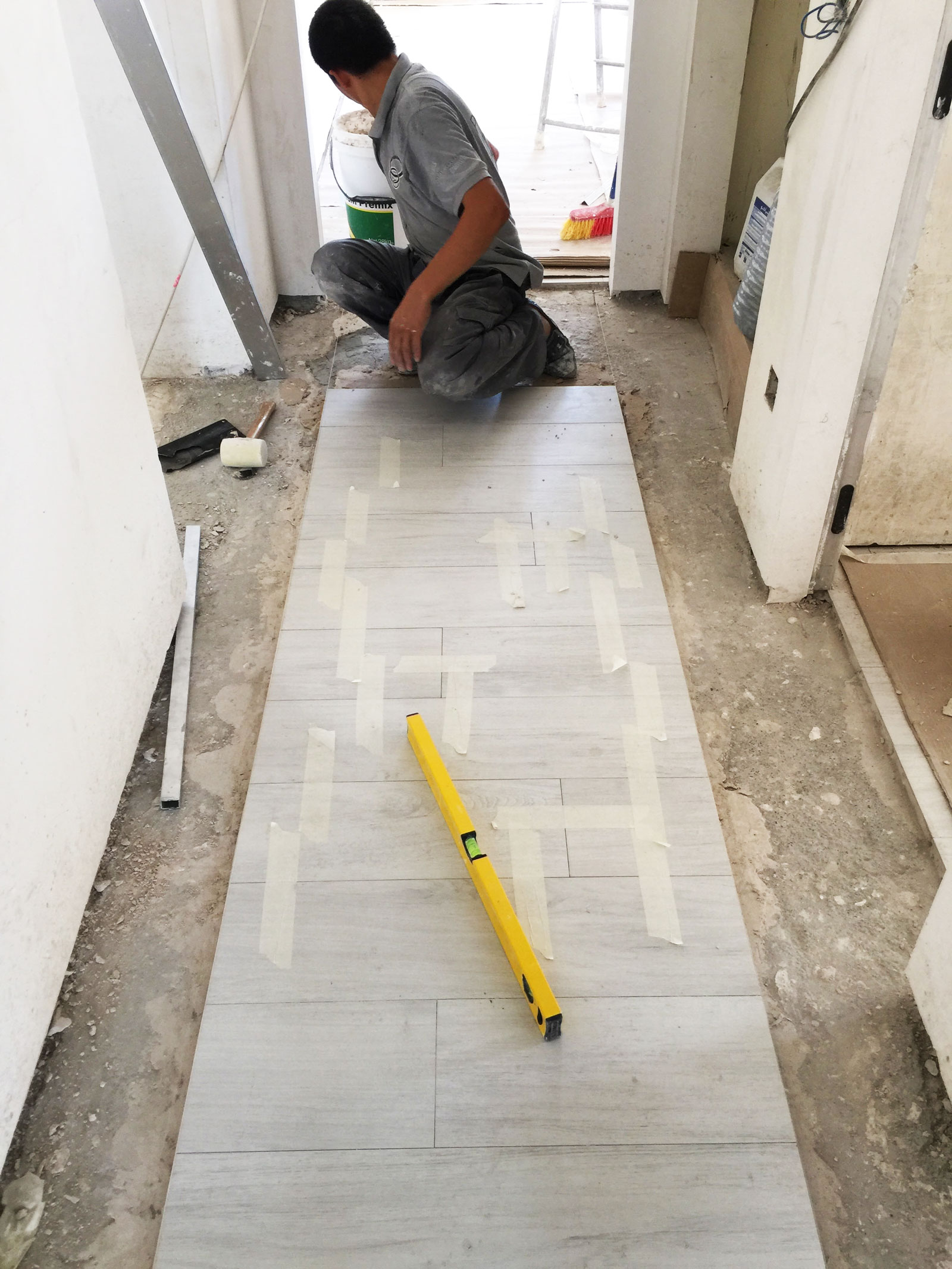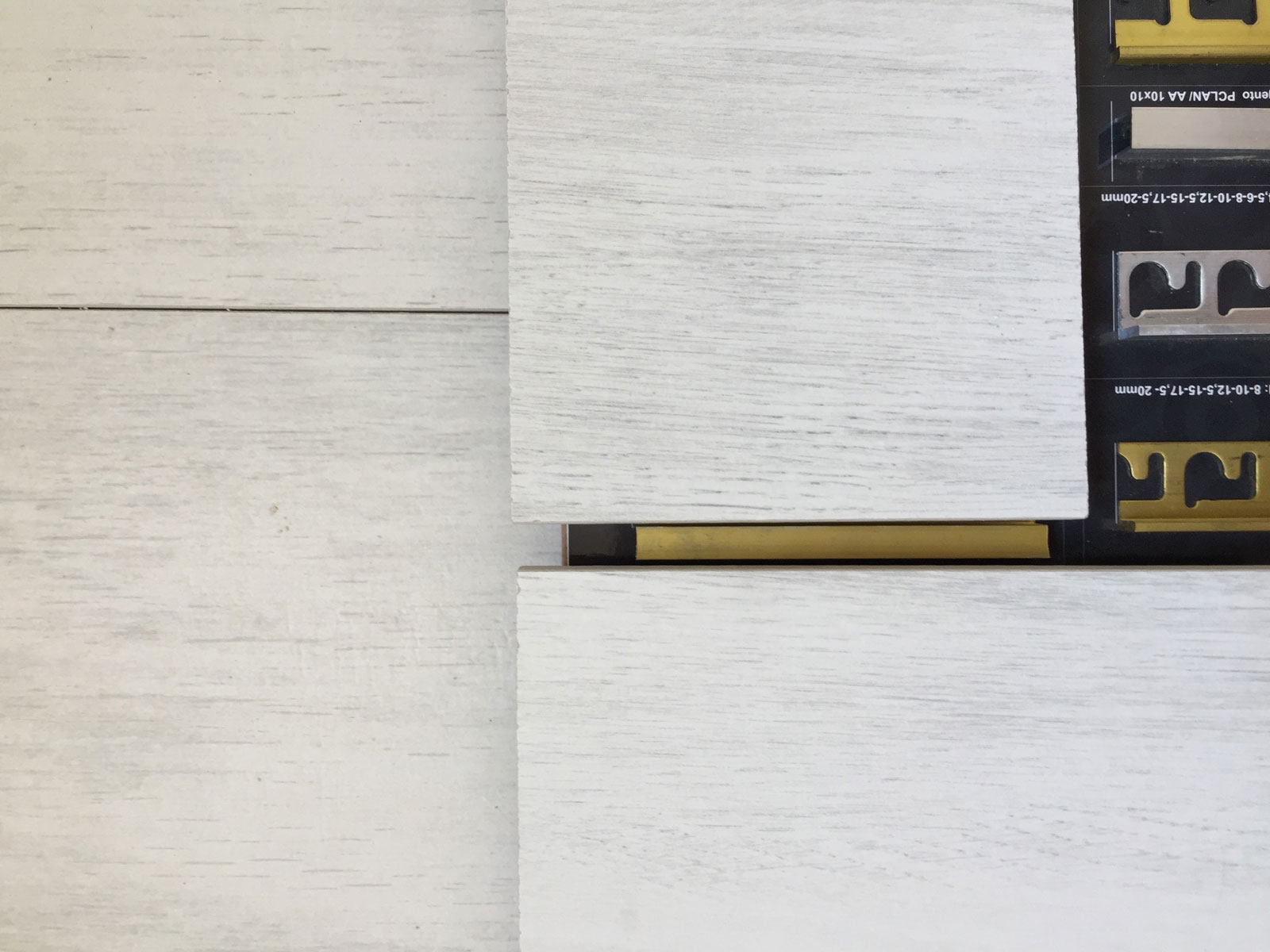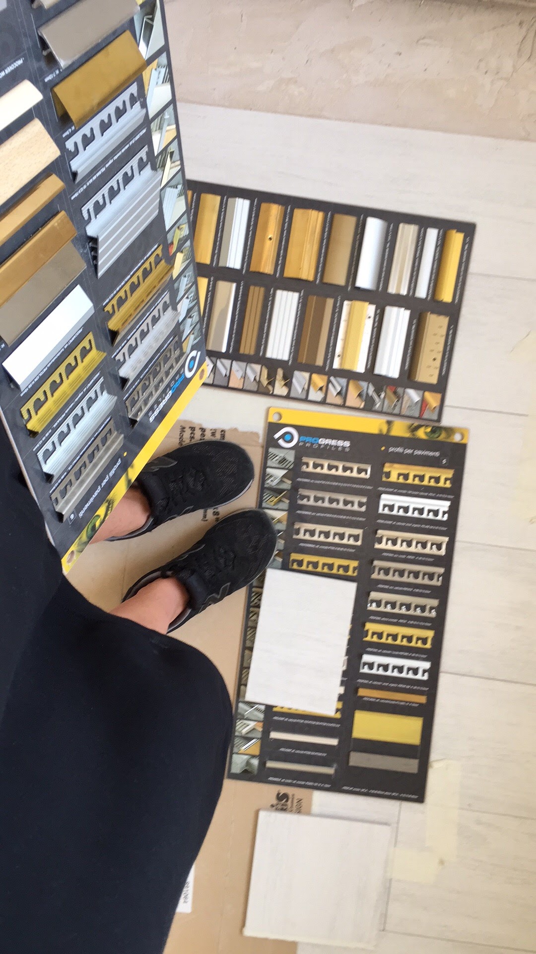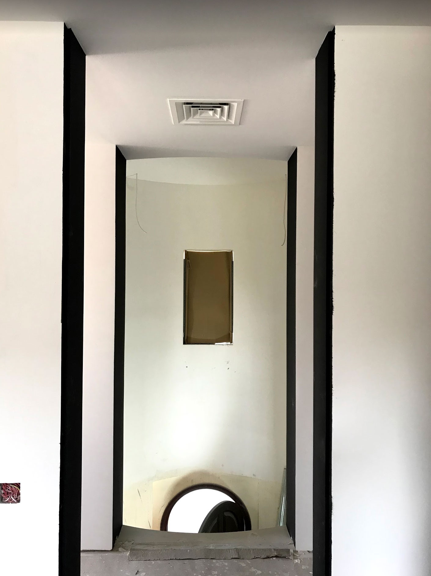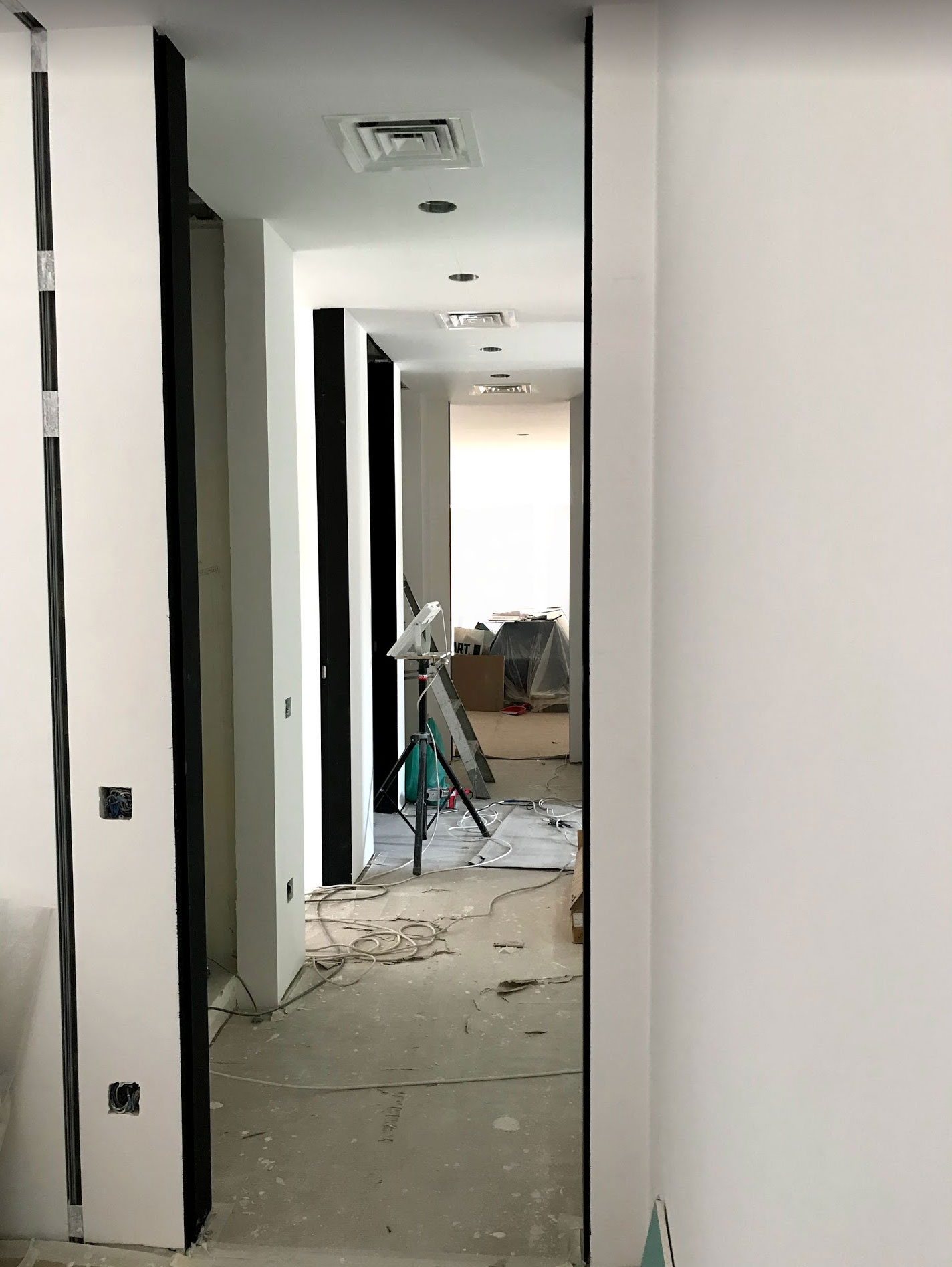Stairs from the ground floor to first, from main hall and living room to bedrooms. On the walls grey plaster and white paint, on a floor and ceiling geometry made by bronze profile